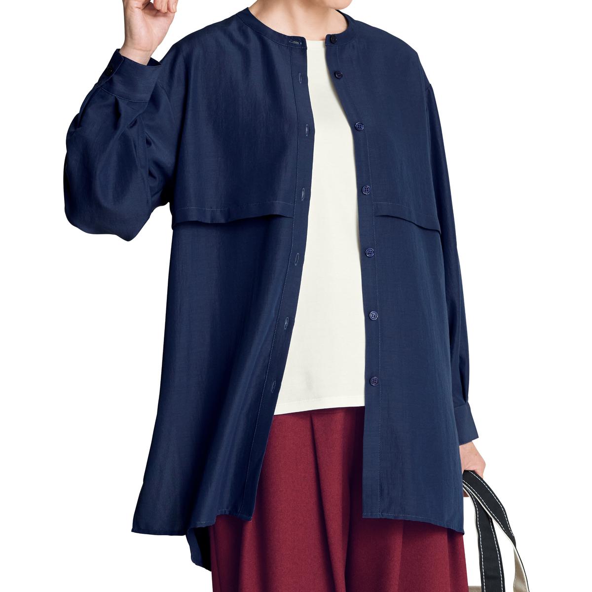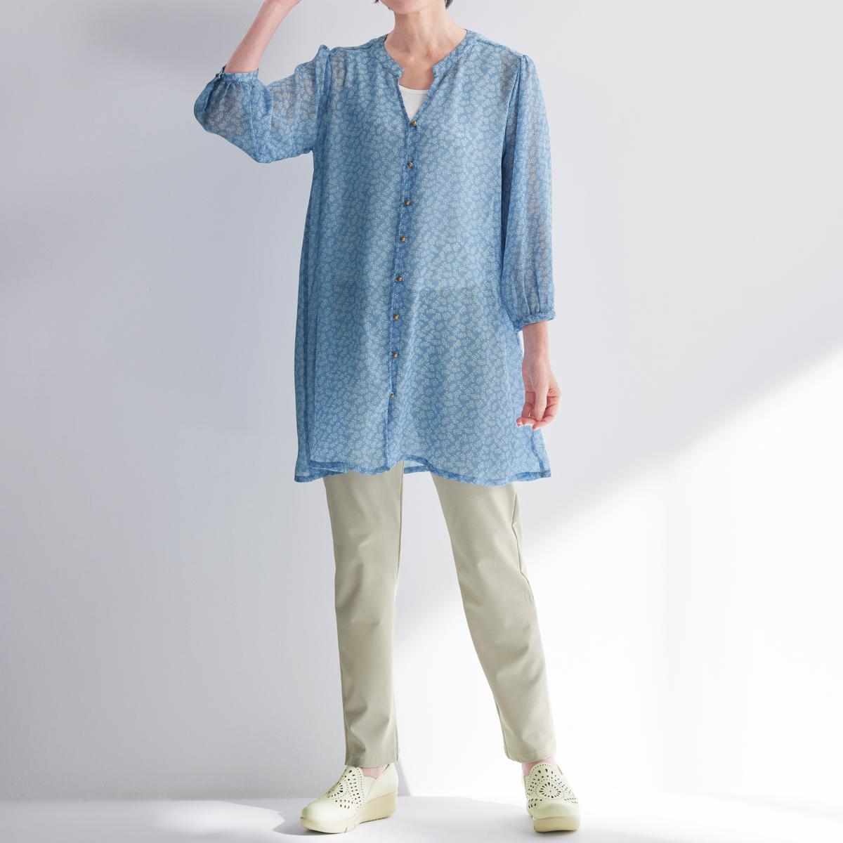 【ビエラピンタックチュニック】すっきりとしたバンドカラーと胸元のピンタックが上品アクセントな、ドロップショルダーのゆったり着心地のよいチュニック。【シフォン楊柳チュニックブラウス】落ち着いた小花柄の透け素材で軽やかにスリム見え!ゆったり腰まわりをカバーするチュニック。袖口と前開きにあしらったアンティーク調のボタン使いで上品に。【切り替えチュニック】2枚重ねの胸元に視線を集めて、ウエストやヒップをさりげなくカバー!薄手で軽やかなビンテージ感のある素材のチュニック。