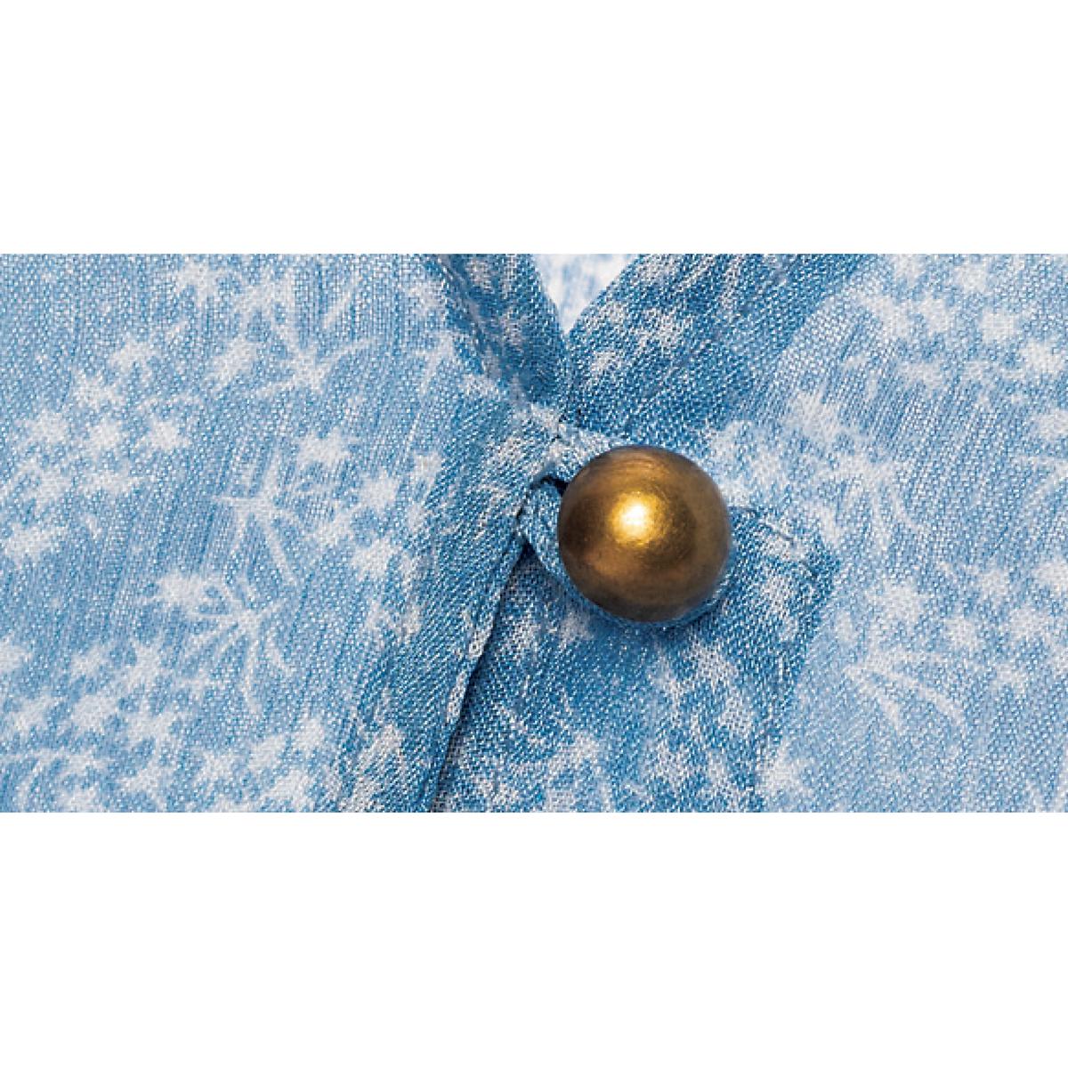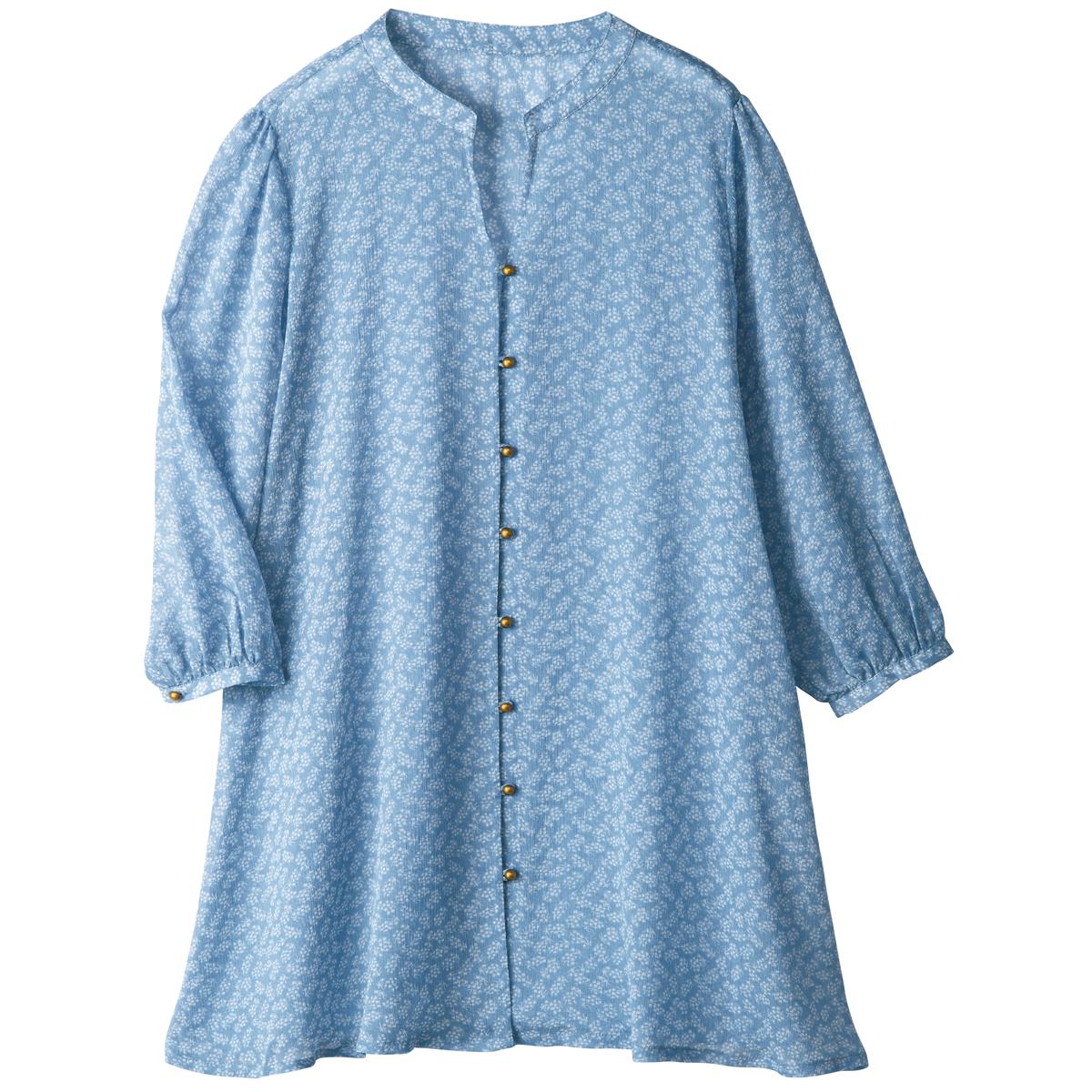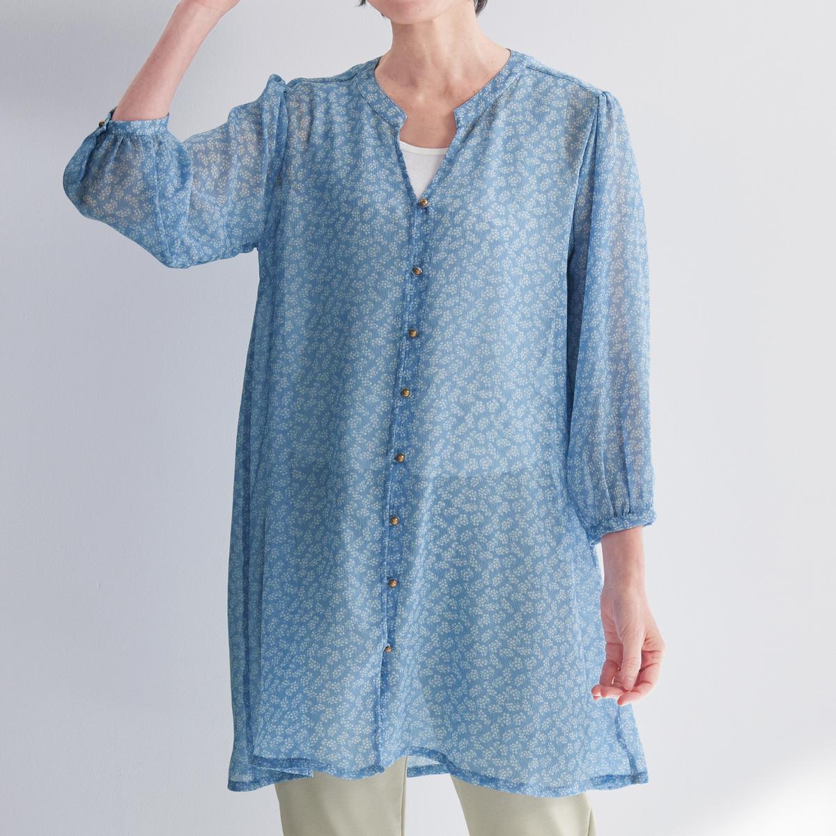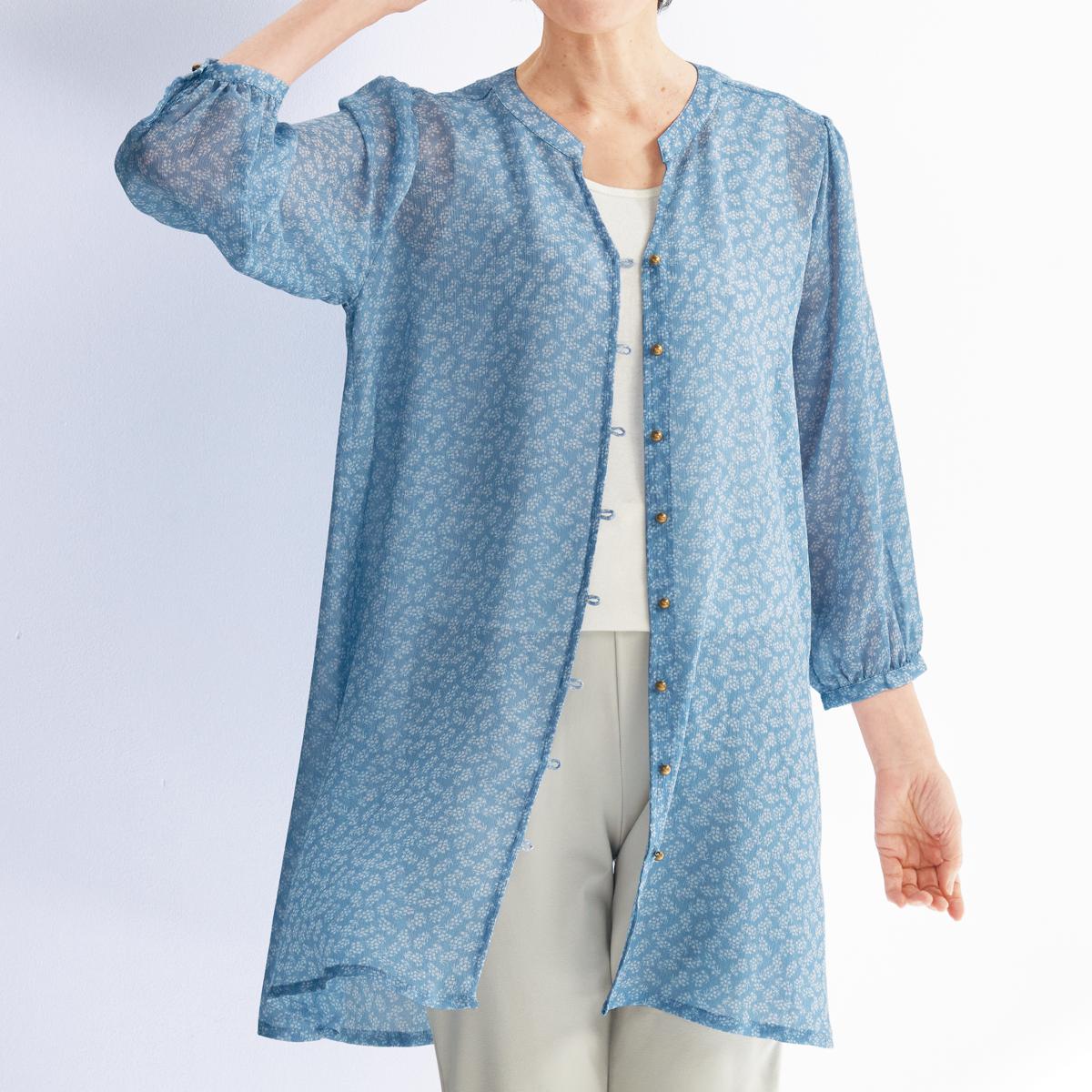 生地拡大透け感とシボ感のあるシフォン楊柳で夏もさわやか。アンティーク調ボタンと甘すぎない小花プリントが落ち着いた雰囲気です。