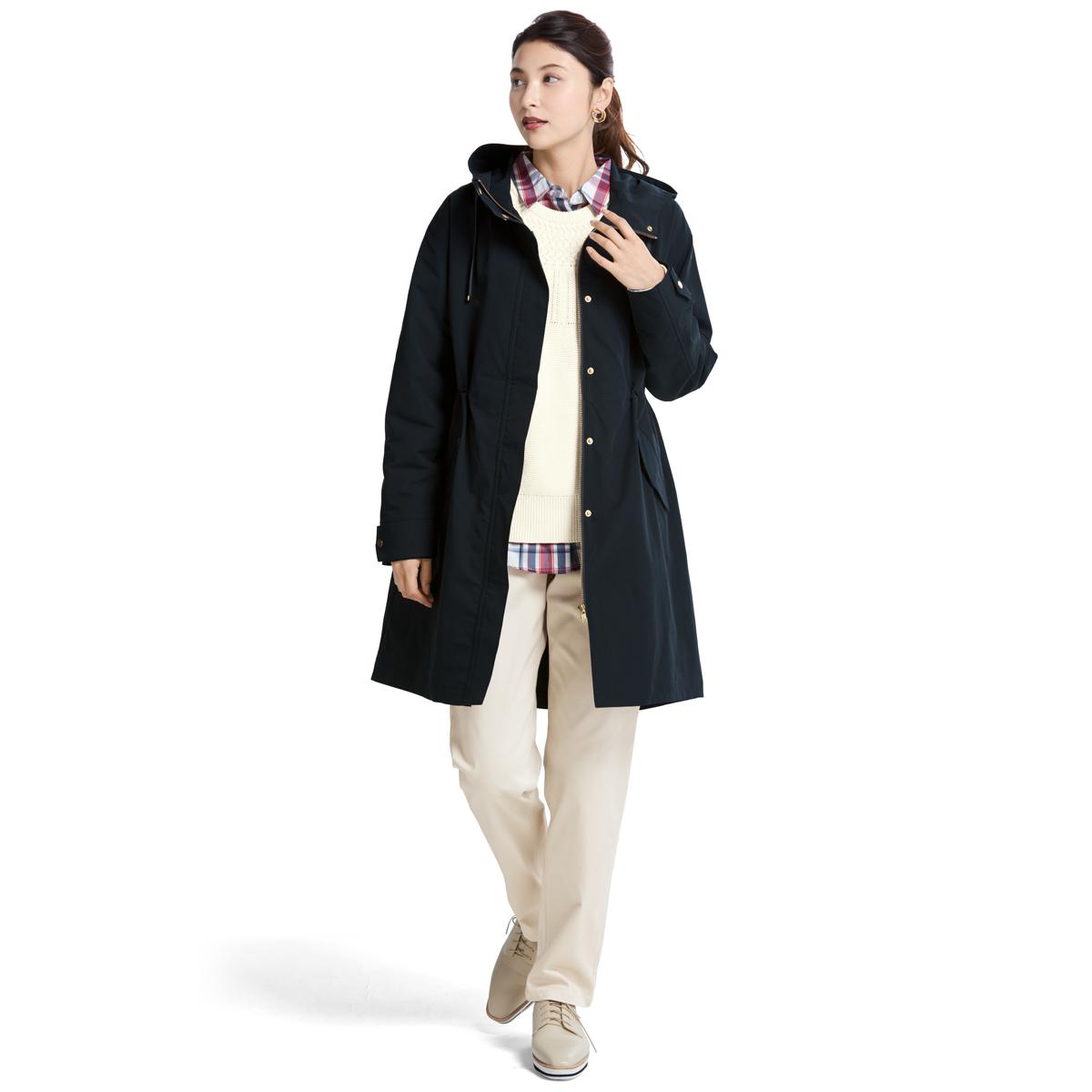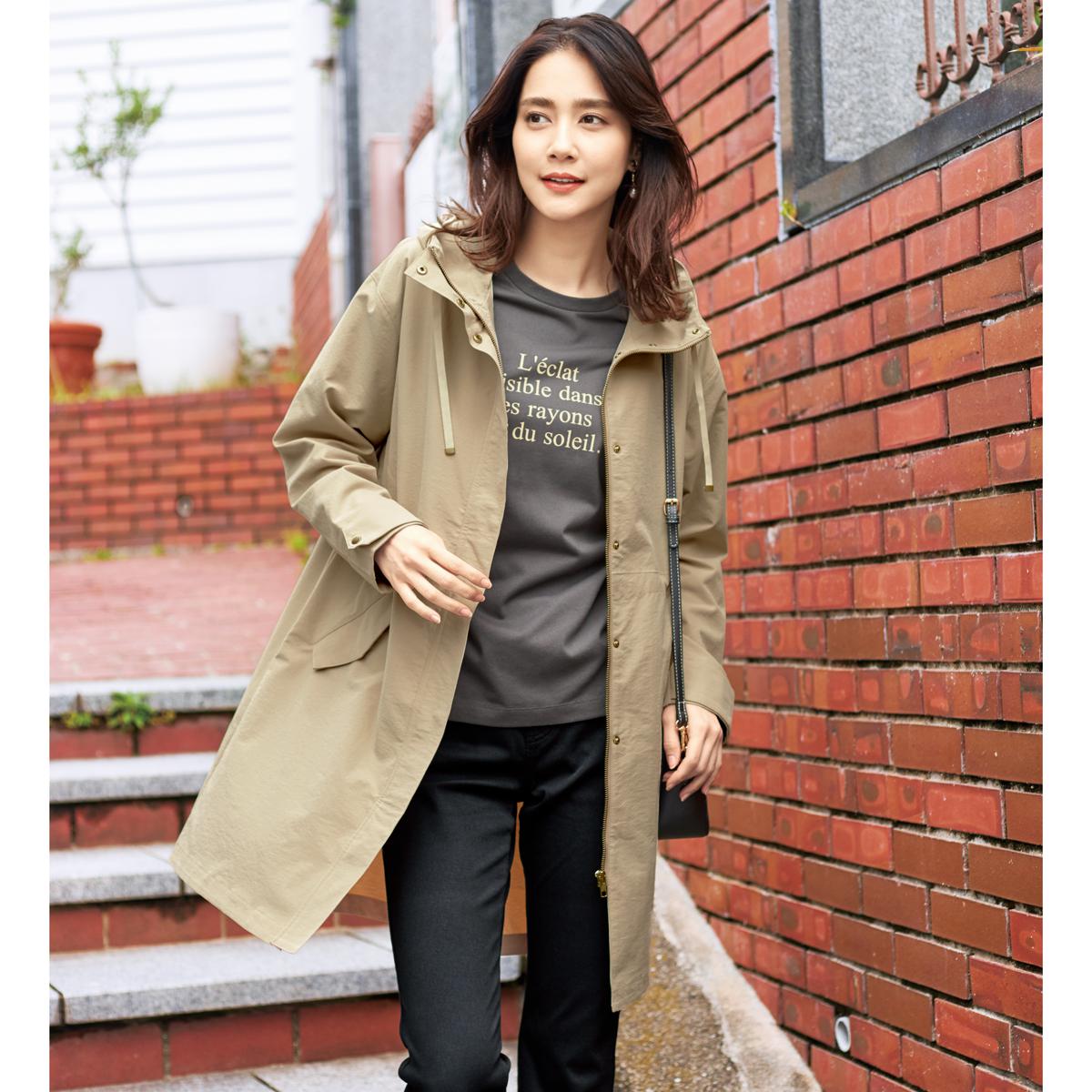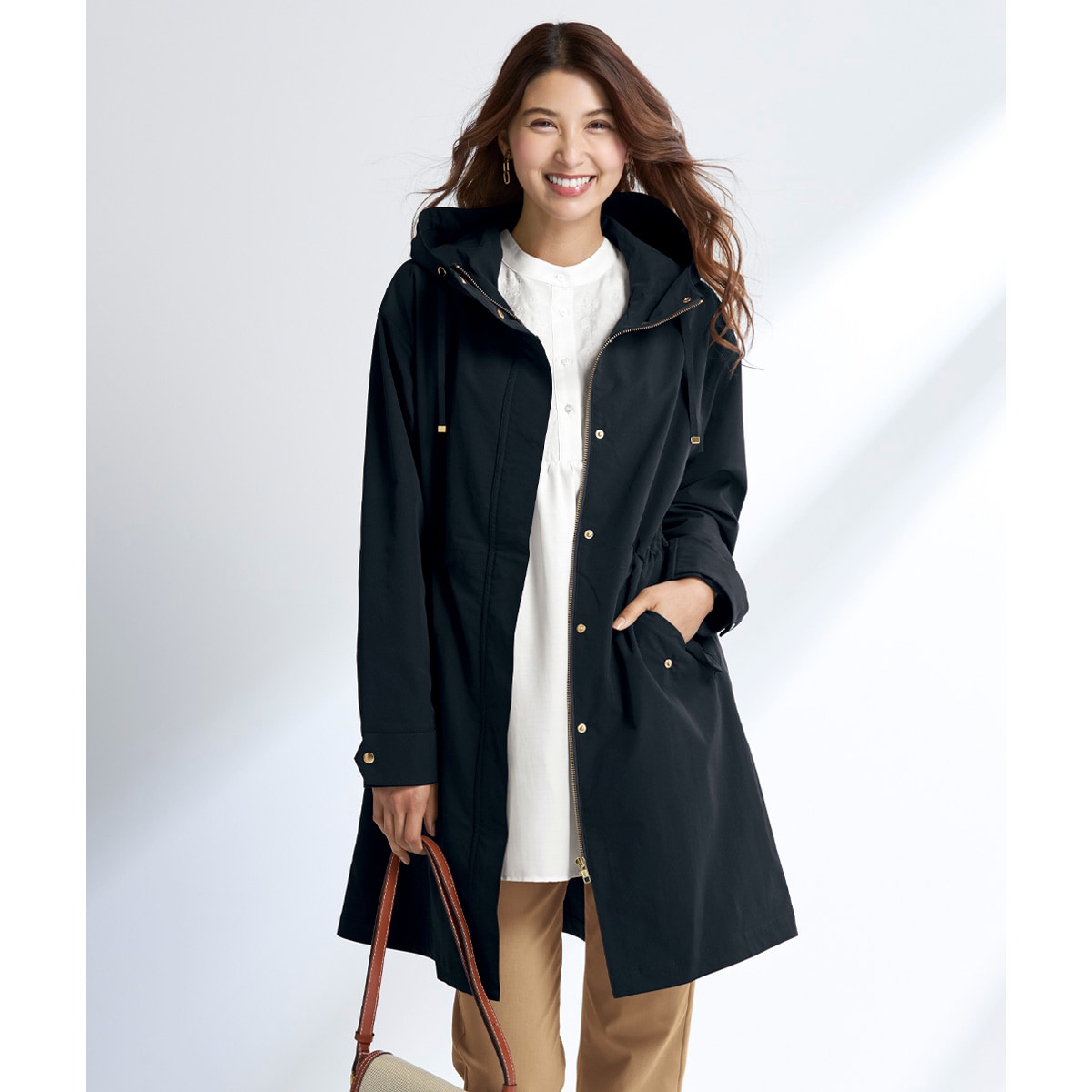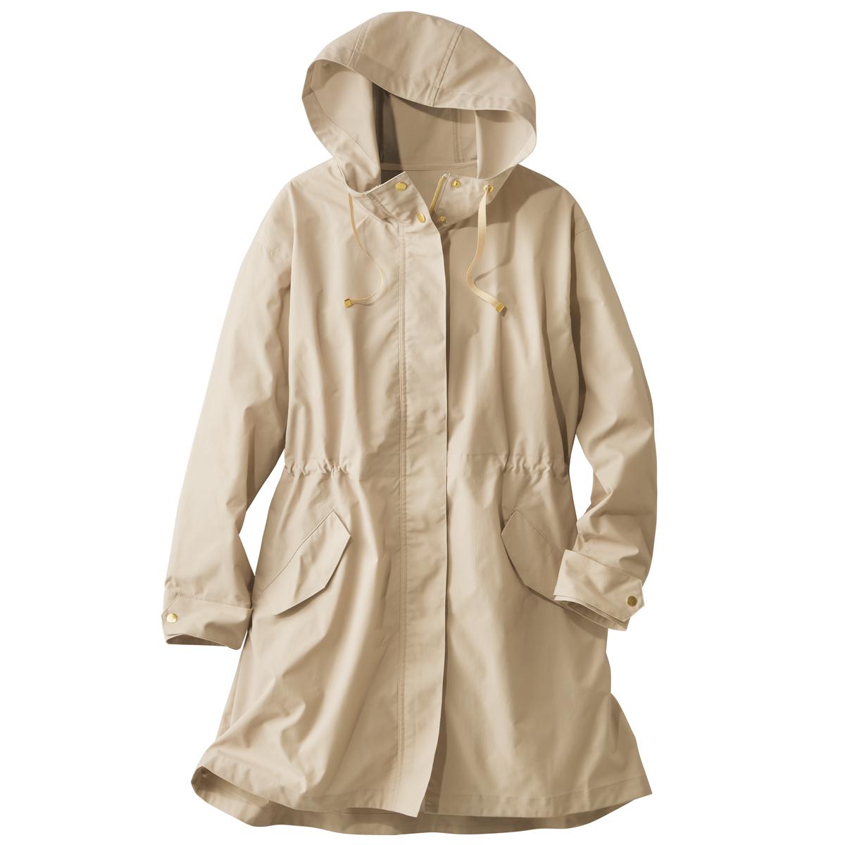 -お買得ポイント-UVカット機能、はっ水加工や速乾機能、洗濯機OKでシワになりにくい嬉しい機能がついています。ラクロンのエアフロー加工でふんわりやわらか、季節の変わり目に便利!!-デザイン-ボタンや金具はゴールドで上品に。衿を高くして風が通りにくくし、大き目のフラップ付ポケットで中身も落ちにくい。ウエスト内側にドロスト付でシルエットの変化も楽しめます。-素材特徴-ラクロンはナチュラル感が特長のポリエステル糸。乾きが早く、さらりとした着心地が続きます。