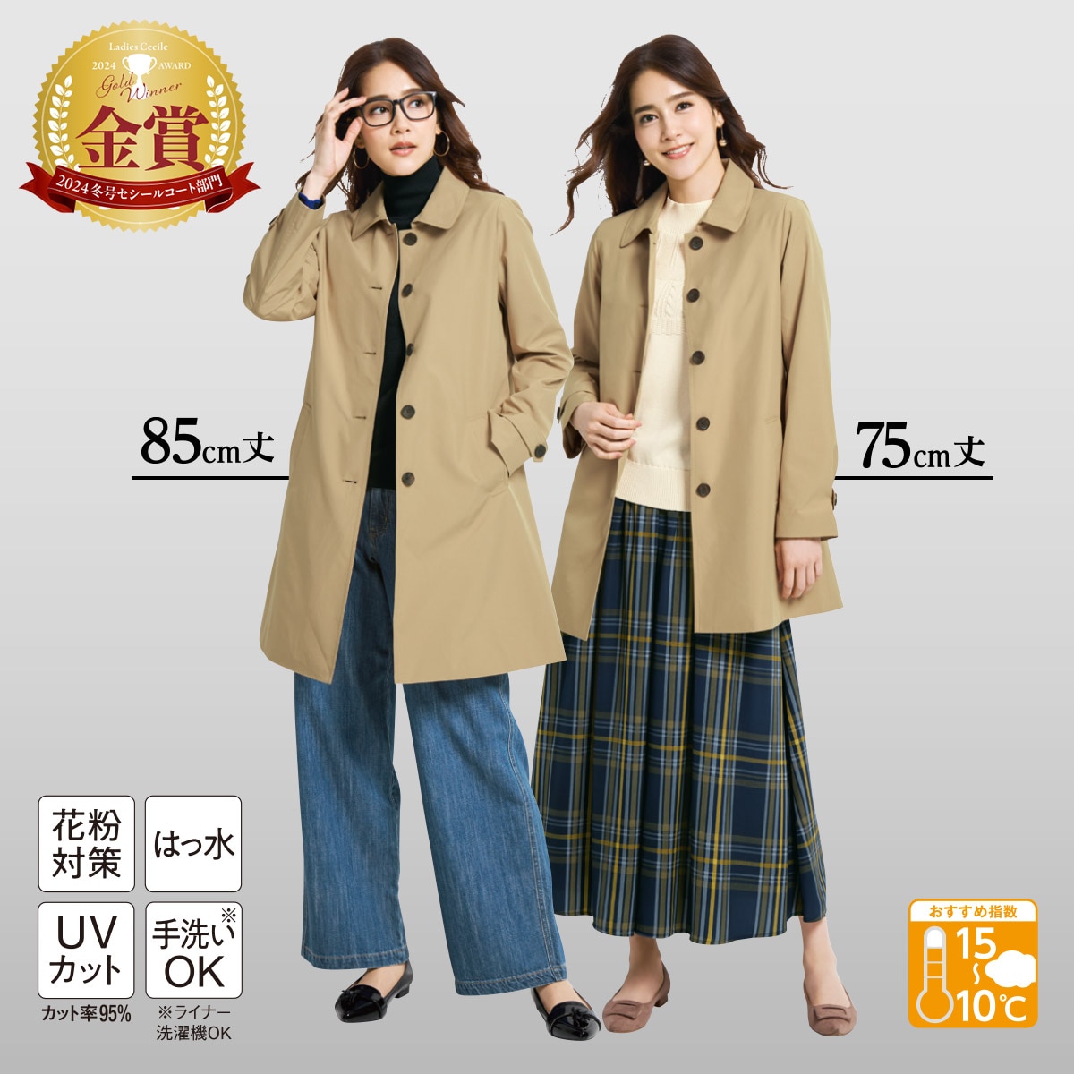 -お買い得ポイント-・気温に合わせて外せるライナー付き・はっ水機能・UVカット率95%・花粉が落ちやすい生地使用・お家で手洗い(ライナーは洗濯機)OKのらくちんお手入れ嬉しい機能たっぷりのお役立ちコート!-デザイン-ベーシックで着やすいステンカラーコートを、バランスよく着こなせて着回しやすい75cm丈と上品でモード感漂う85cm丈の2丈からお好みでお選びいただけます。-素材特徴-細い糸を高密度で織りあげてつるんと滑らかな生地表面にすることで花粉を落ちやすくしたポランバリア®Vを使用!
