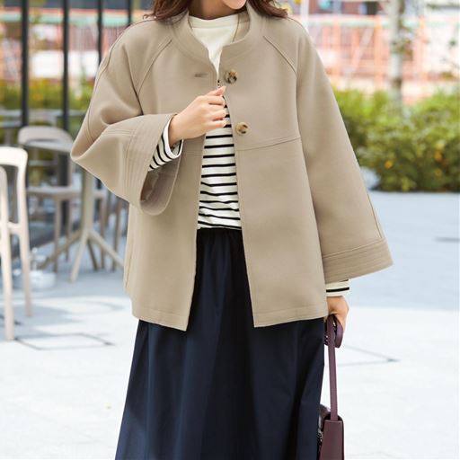 -お買い得ポイント-合わせやすい丈や大人可愛いデザインに心が華やぎます。-デザイン-上品な印象を高めるハイネックと広がった袖が素敵。衿や袖口のステッチワークがアクセントになって、多彩なコーデに映えます。-素材特徴-微起毛がほんのり暖かいウールのような風合いです。ジャージ素材なので程よく伸びてラクな着心地。手軽に羽織れます。