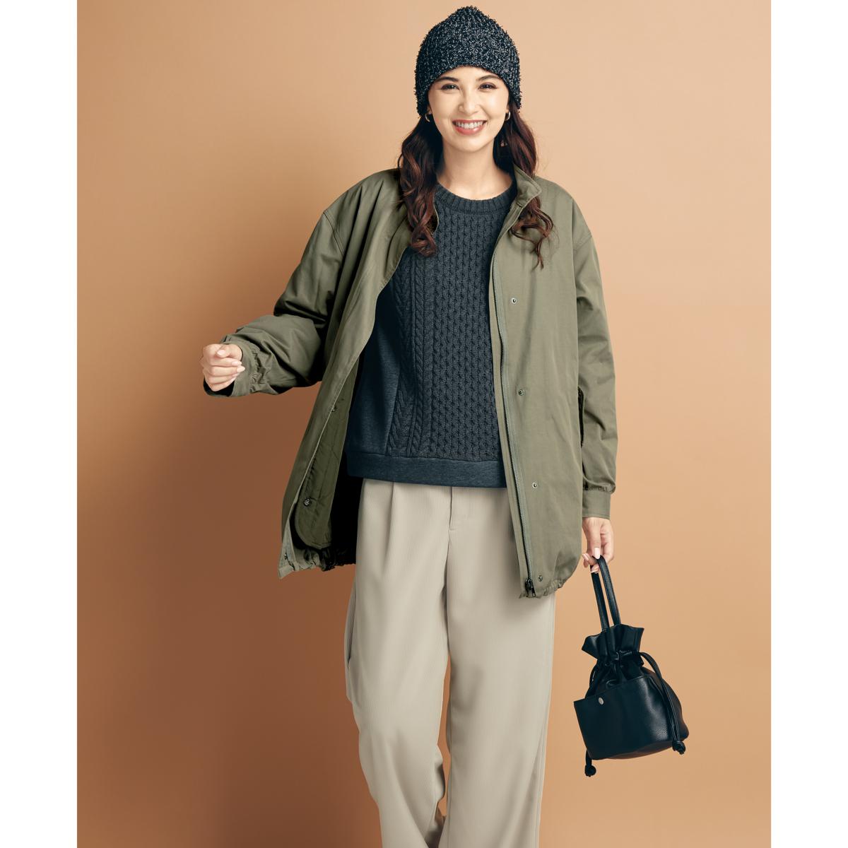 -お買い得ポイント-インにニットを合わせても動きやすいビッグシルエットです。バランス良く着こなせる丈感が◎。-デザイン-衿を立て首元をカバーし、風を通しにくくするスタンドカラー。裾にシルエットの変化を楽しめるドロスト付き。ファスナー&ボタンの二重仕様で暖かい。ものを入れやすく落ちにくいフラップポケット付き。-素材特徴-洗い加工したようになめらかな微起毛素材。