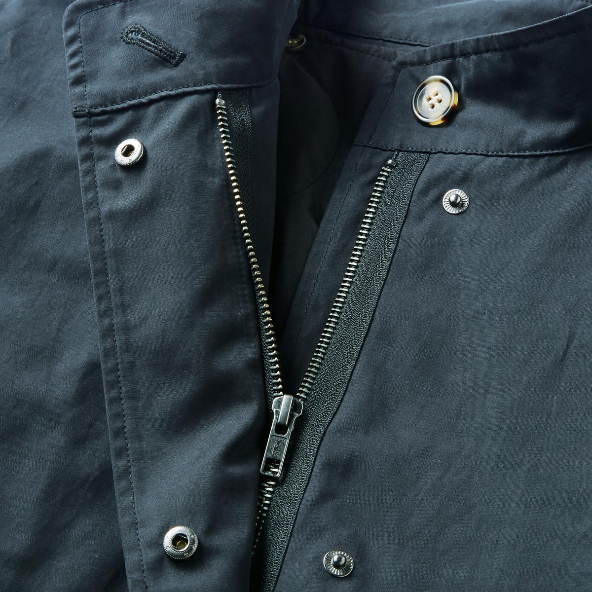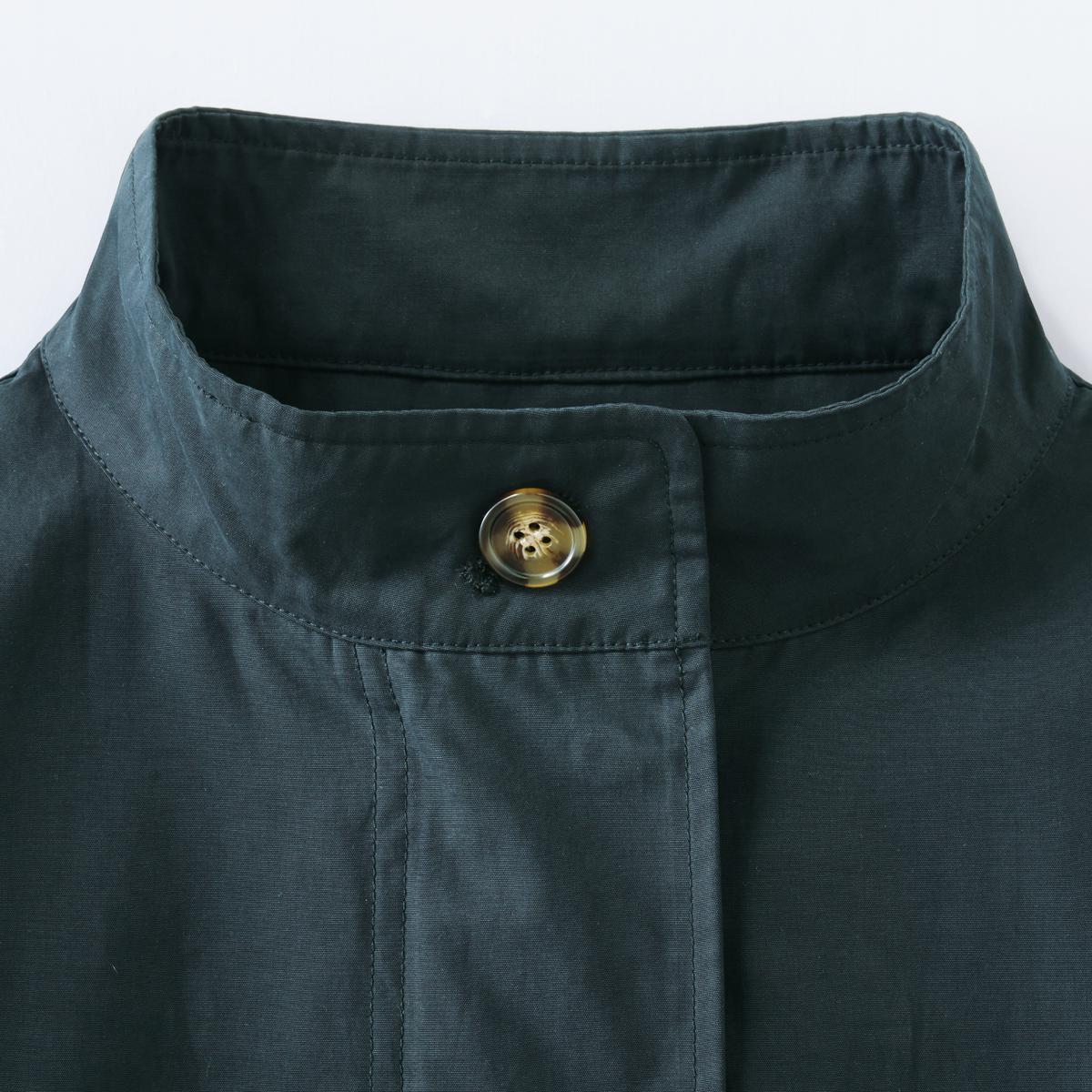 衿元を立て首元をカバーし、風を通しにくくするスタンドカラー。