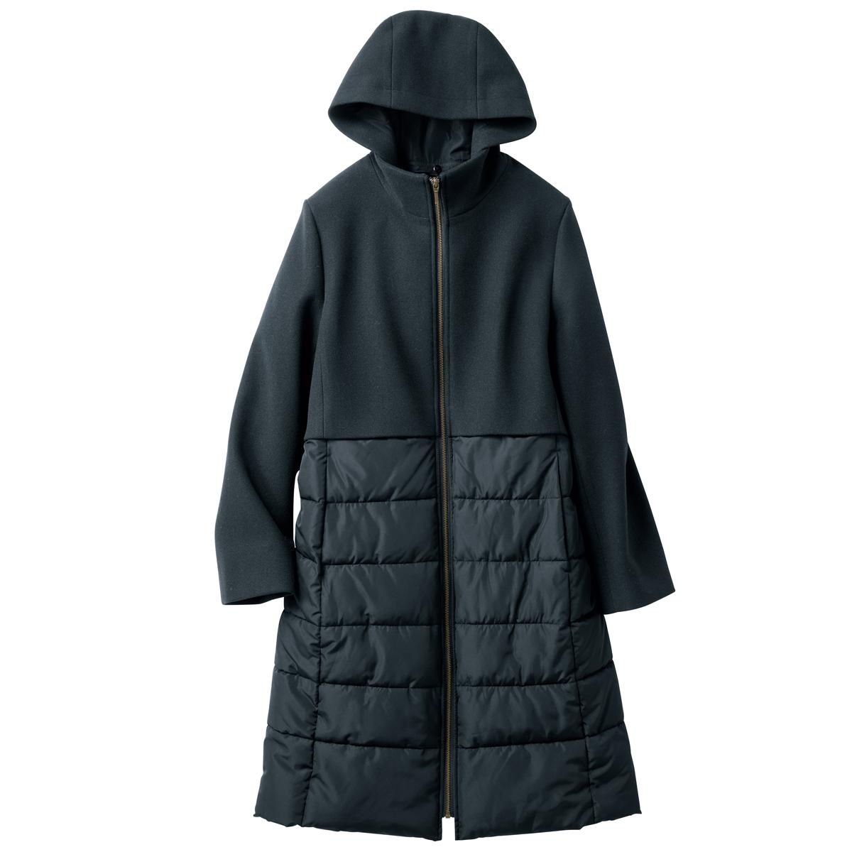 -お買い得ポイント-軽く暖かなフェイクウールと、タフタの異素材使いが個性的。-デザイン-上身頃はウール調素材を使用し、空気を含んでふんわり暖かく軽くスッキリした印象。下身頃はヒップラインをカバーできる長さで安心の着丈。フードも取り外せてスタイリングの幅が広がります。-素材特徴-上身頃には、中心部に空洞があるポリエステル「中空糸」を使ったウール調素材、下身頃はリサイクル蓄熱中わた(ETHERMALOFTR®)入り。