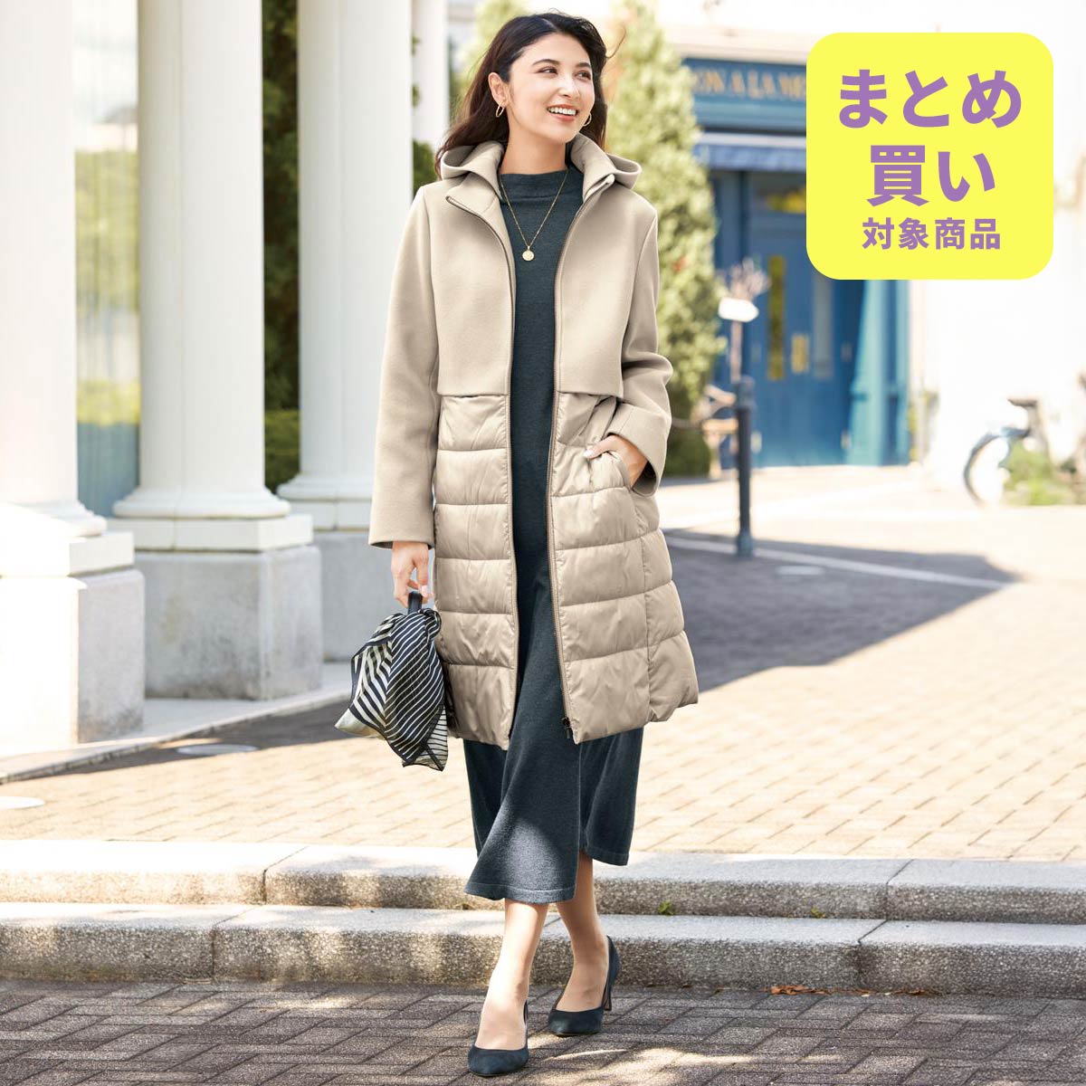 上身頃はウール調素材を使用し、空気を含んでふんわり暖かく軽くスッキリした印象。下身頃はヒップラインをカバーできる長さで安心の着丈。