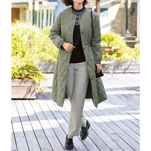 薄くて軽くあたたかなキルト素材のロングコート。保温性のあるリサイクル蓄熱保温中わたETHERMALOFT®を使用。