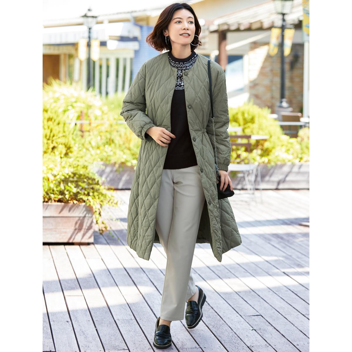 寒い日もキルティングなので軽やかに着れるところがポイントです。ウエストを絞れることで、すっきりとしたシルエットになり足長効果も♪