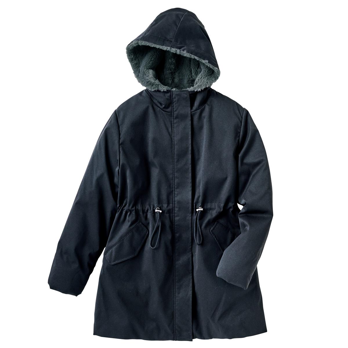-お買い得ポイント-なめらかなフェイクファーでめちゃぬく!フード裏もだから、首元を閉じればしっかり防寒で暖かいです。しっかりとしたツイル生地ではっ水機能付きも嬉しい。-デザイン-ウエストにドロスト仕様だから、シルエットに変化を付けられます。絞ればスッキリとした着こなしに!風が入りにくい袖口内側ゴム仕様で冷気もへっちゃら。-素材特徴-身頃裏とフード裏、ポケット内側はフェイクファーで、袖は蓄熱薄中わた(ETHERMALOFTR)入りで、着るだけであったか!裏地付きで腕を通しやすいのも嬉しい♪