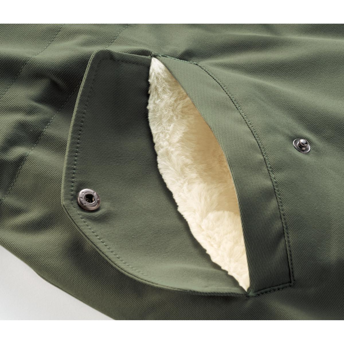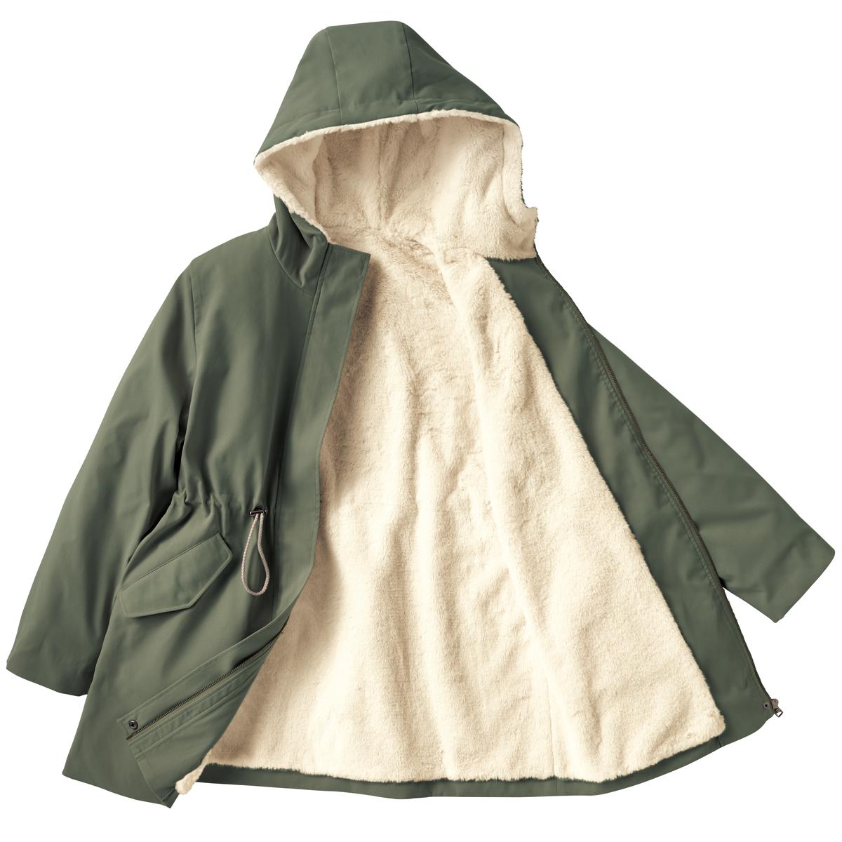 カーキ 身頃とフードの裏地はあたたかなフェイクファー