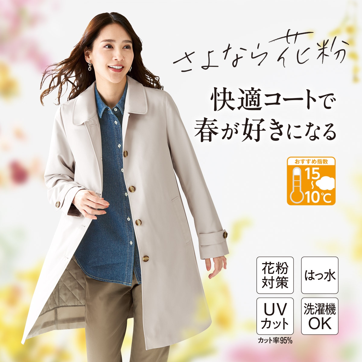 -お買い得ポイント-ライナー付きで、気温に合わせて着脱可能。まだ肌寒い春先から長くご着用いただけます。花粉がつきにくく、はっ水加工を施しているので突然の雨でも安心です。-デザイン-ベーシックで着やすいステンカラーコートを、バランスよく着こなせて着回ししやすい75cm丈と上品な印象の85cm丈の2丈からお好みでお選びいただけます。-素材特徴-つるんとなめらかな素材に日本製の繊細な凹凸ナノ粒子を生地表面に付与することで花粉が付きにくくなっています。