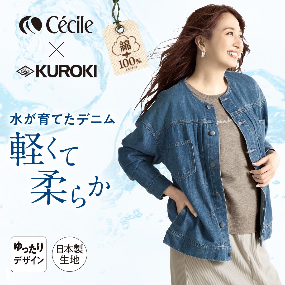 KUROKIが本拠とする岡山県井原市は天然の軟水に恵まれた地。染色工程においては、この水を存分に用い、やわらかな風合いに仕上げます。その心地良い肌ざわりを保つため、セシールオリジナルのデニム素材は、ベトナムの軟水で洗いをかける工程を追加。卓越したクオリティを堪能できます。