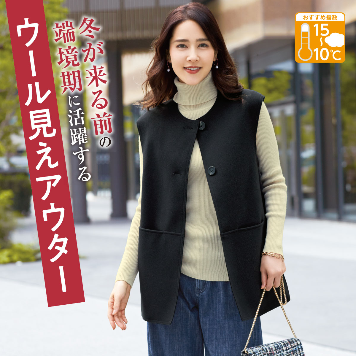 -お買い得ポイント-体を締め付けない軽やかな着用感で腰まで暖かく、体型もカバーします。-デザイン-フロントのポケットが遊び心を感じさせるベストです。-素材特徴-微起毛がほんのり暖かいウールのような風合いです。ジャージ素材なので程よく伸びてラクな着心地。手軽に羽織れます。