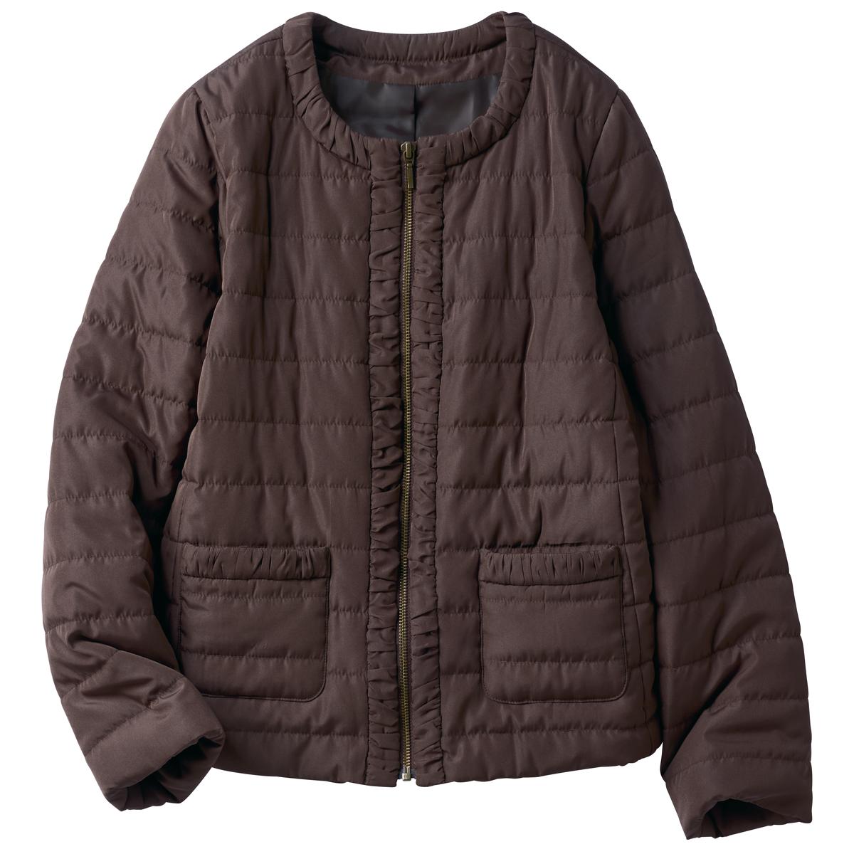 ノーカラーの中綿ブルゾンは、すっきり見えるシルエットが魅力的。