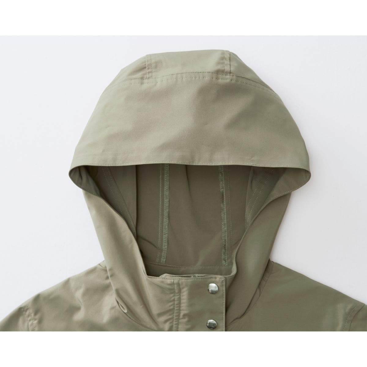 頭部や首元を風からガードする深めのフード&衿高設計。
