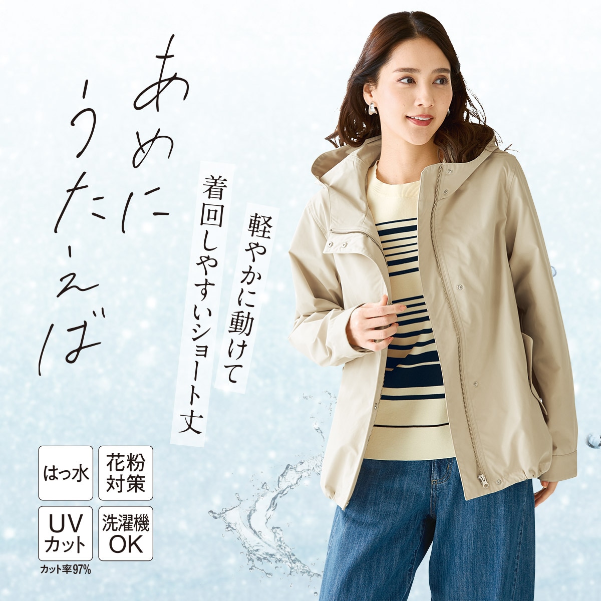 はっ水 花粉ガード 多少の雨でも安心 急な天候変化でも慌てない、はっ水加工 花粉が付きにくく落ちやすい 花粉ガード機能を加えた、ハリ感のあるしっかりとした素材