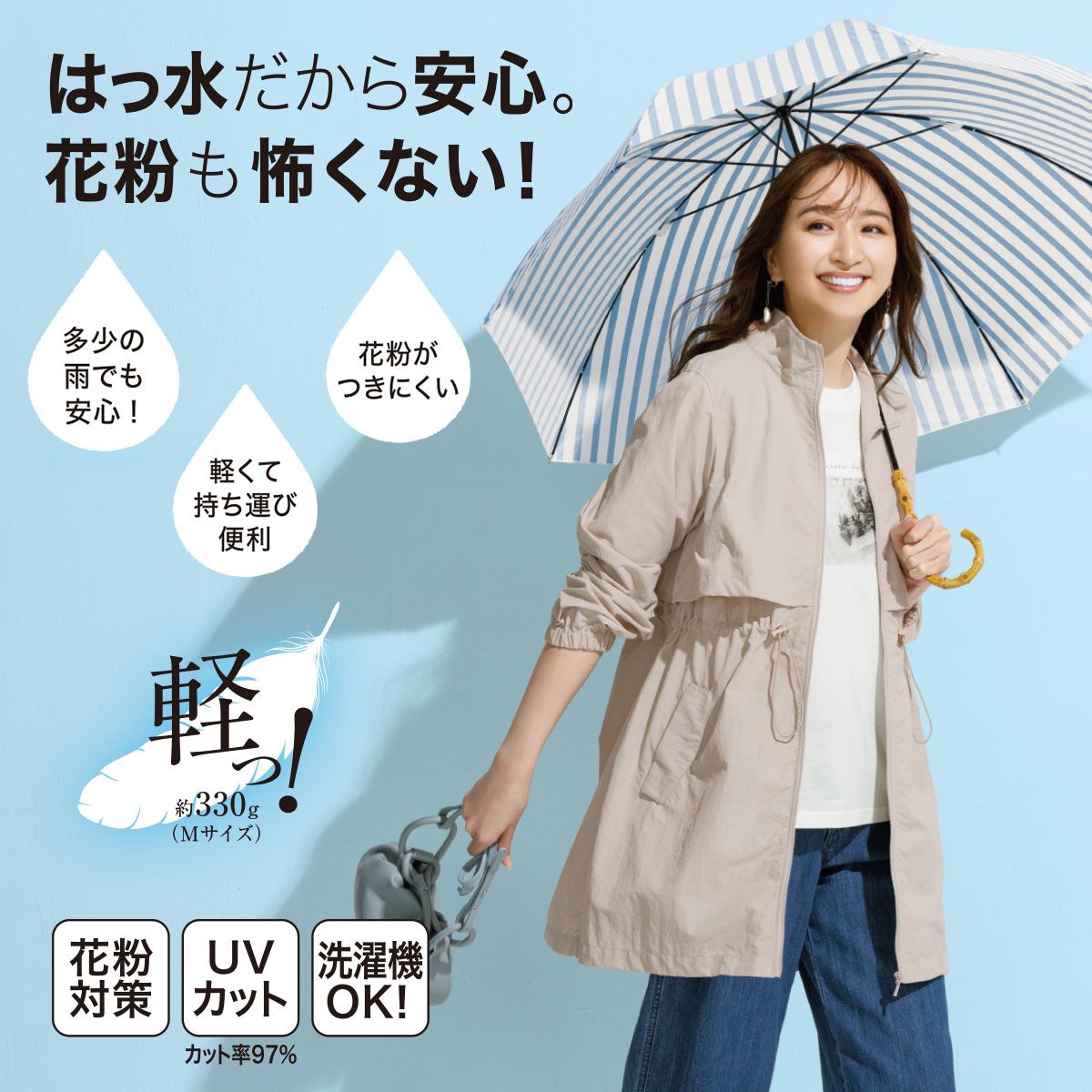 -お買い得ポイント-軽やかな着心地でサッと羽織りやすく、スタンドカラーが花粉をしっかり防御。-デザイン-フロントファスナー仕様がすっきりとした印象に。シルエットの変化を楽しめるウエストドロスト付き。-素材特徴-シワが目立ちにくいワッシャー加工素材。はっ水加工を施しているので、急な小雨も安心です。花粉がつきにくく、軽くて持ち運びが便利なのもうれしいポイントです。