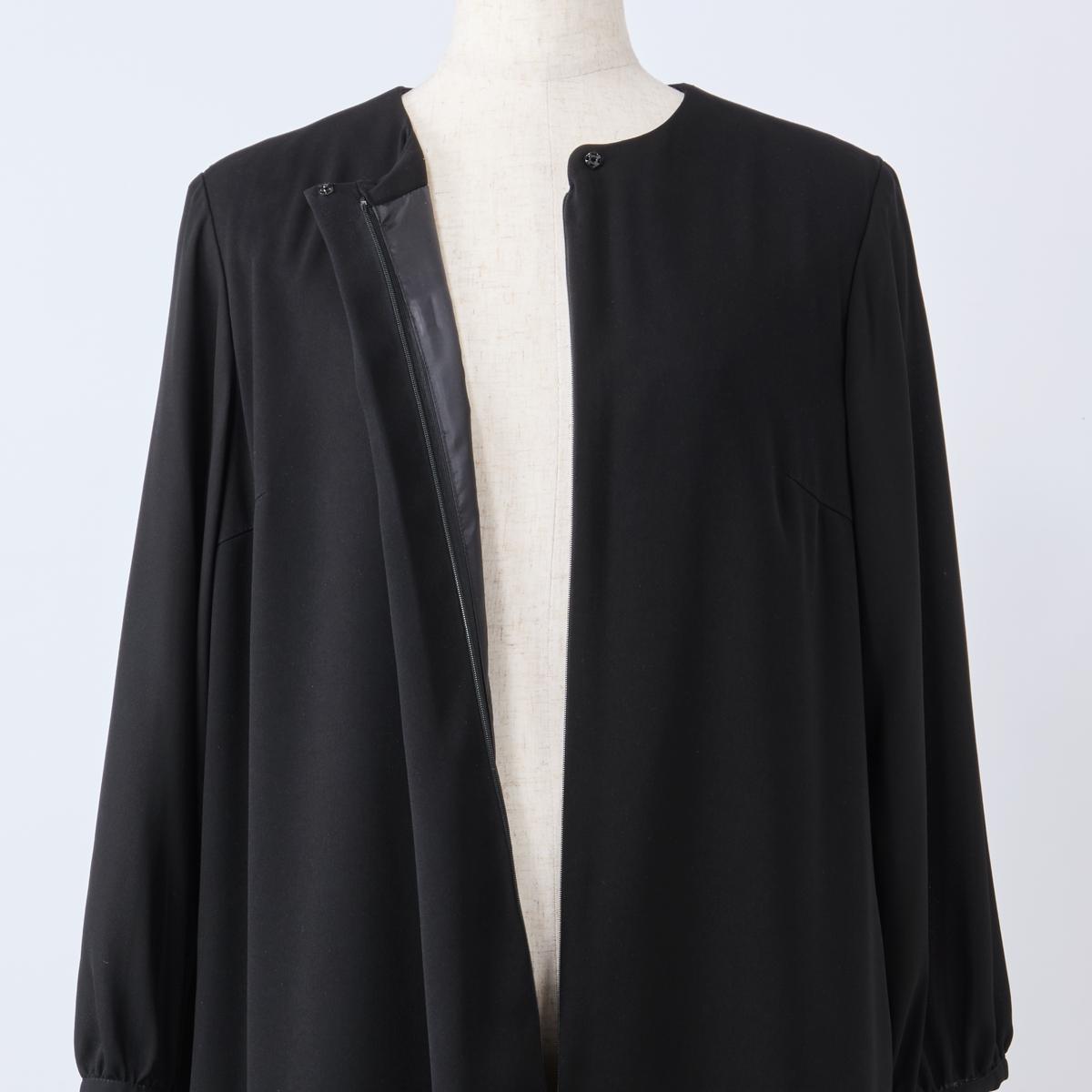 -お買い得ポイント-程よい光沢のサテン素材にシンプルなデザインが凛とした佇まいを醸し出しています。-デザイン-大きく開くフロントファスナーで脱ぎ着がラク。スマホがすっぽり入る大きめポケット付き。-素材特徴-濃く深みのある黒を風合い豊かに染め上げた、日本製生地を使用。自宅の洗濯機で洗えるのもうれしいポイントです。