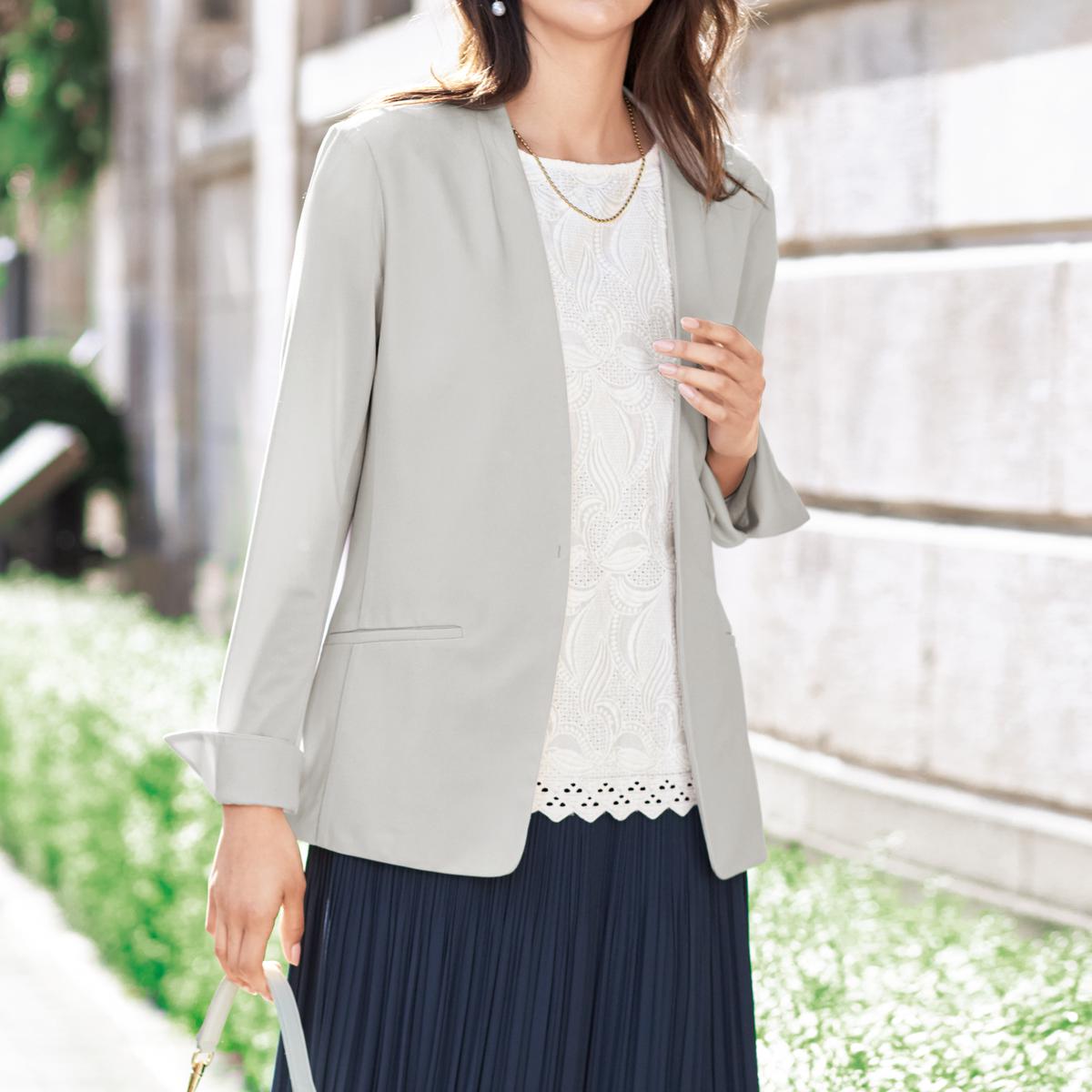 -お買い得ポイント-カーデ感覚の伸びやかな着心地です。-デザイン-シャープなノーカラーできちんと感をキープ。-素材特徴-程よい伸縮性で柔らかく、表情が美しいリネンライクなカットソー素材。シャリっとした爽やかな肌ざわりです。