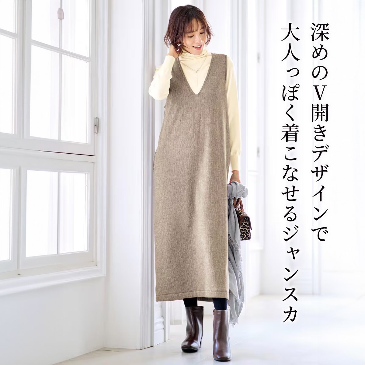 -お買い得ポイント-裏シャギーで寒い日もあたたく着れるジャンスカです。深めのV開きでタートルや中に着るアイテムも合わせやすい。-デザイン-深めのV開きデザインで大人っぽく着こなせるジャンスカは、ご旅行にもおでかけにも大活躍。体のラインが出にくいので、気楽に着れる1枚です。-素材特徴-ご自宅でお洗濯もでき、裏シャギーもあたたかい素材なのが特徴です。身丈の長さがたっぷりあることで、裏シャギーのあたたかさをより感じていただけます。