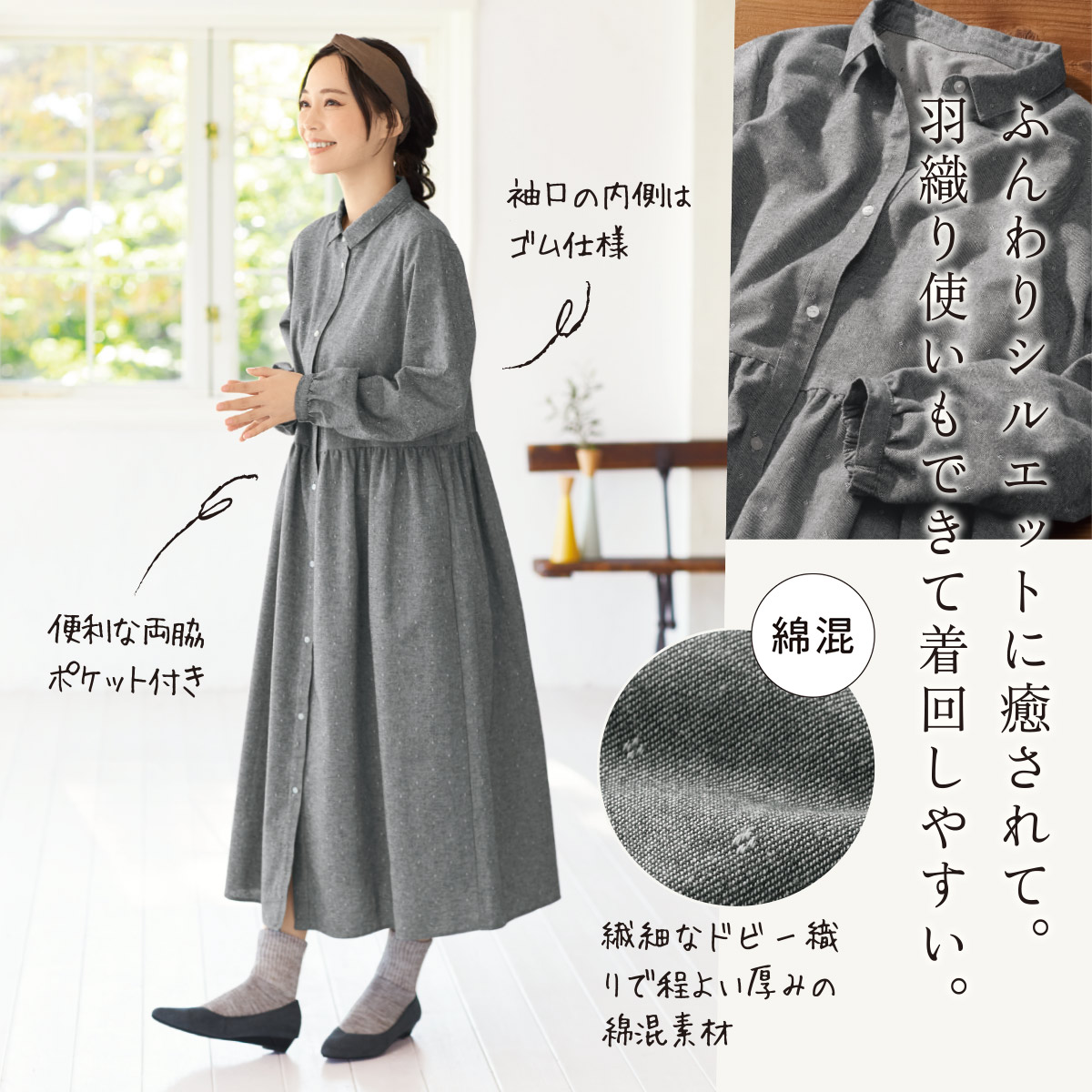 -お買い得ポイント-ふんわりシルエットに癒されます。前ボタン開きなので、羽織り使いもできて着回しやすい。-デザイン-袖口の内側は便利なゴム仕様。便利な両脇ポケット付き。 -素材特徴-繊細なドビー織りで程よい厚みの綿混素材。