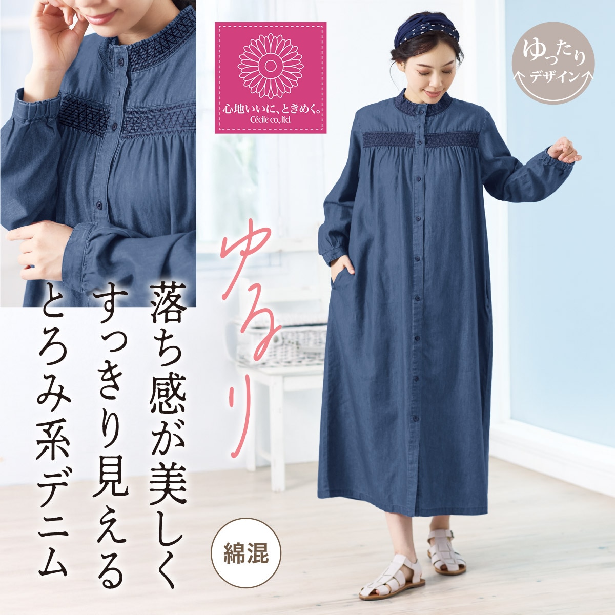 -お買い得ポイント-さりげなく体型をカバーする落ち感で、締め付け感もなくリラックス気分。上品カジュアルな装いに華を添える繊細なディテールに心躍ります。-デザイン-衿まわりや胸元の繊細なスモッキング刺しゅうが程よい甘さをプラス。-素材特徴-やさしい肌ざわりの綿混デニム素材。すとんと落ちる柔らかな風合いで着心地ラクチン。