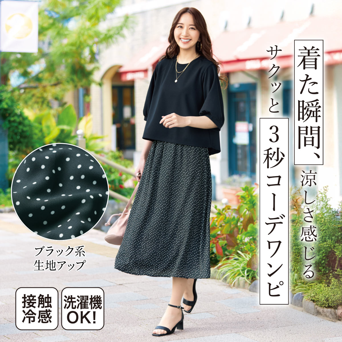 -お買い得ポイント-着た瞬間、涼しさ感じるサクッと3秒コーデワンピ。-デザイン-セットアップのように着こなせるドッキングワンピ。ウエストゴムで軽やかな着用感のスカートがふんわり広がって優美なムードです。-素材特徴-裏地はカットソー素材で伸縮性があり動きやすくひんやりした肌ざわりです。