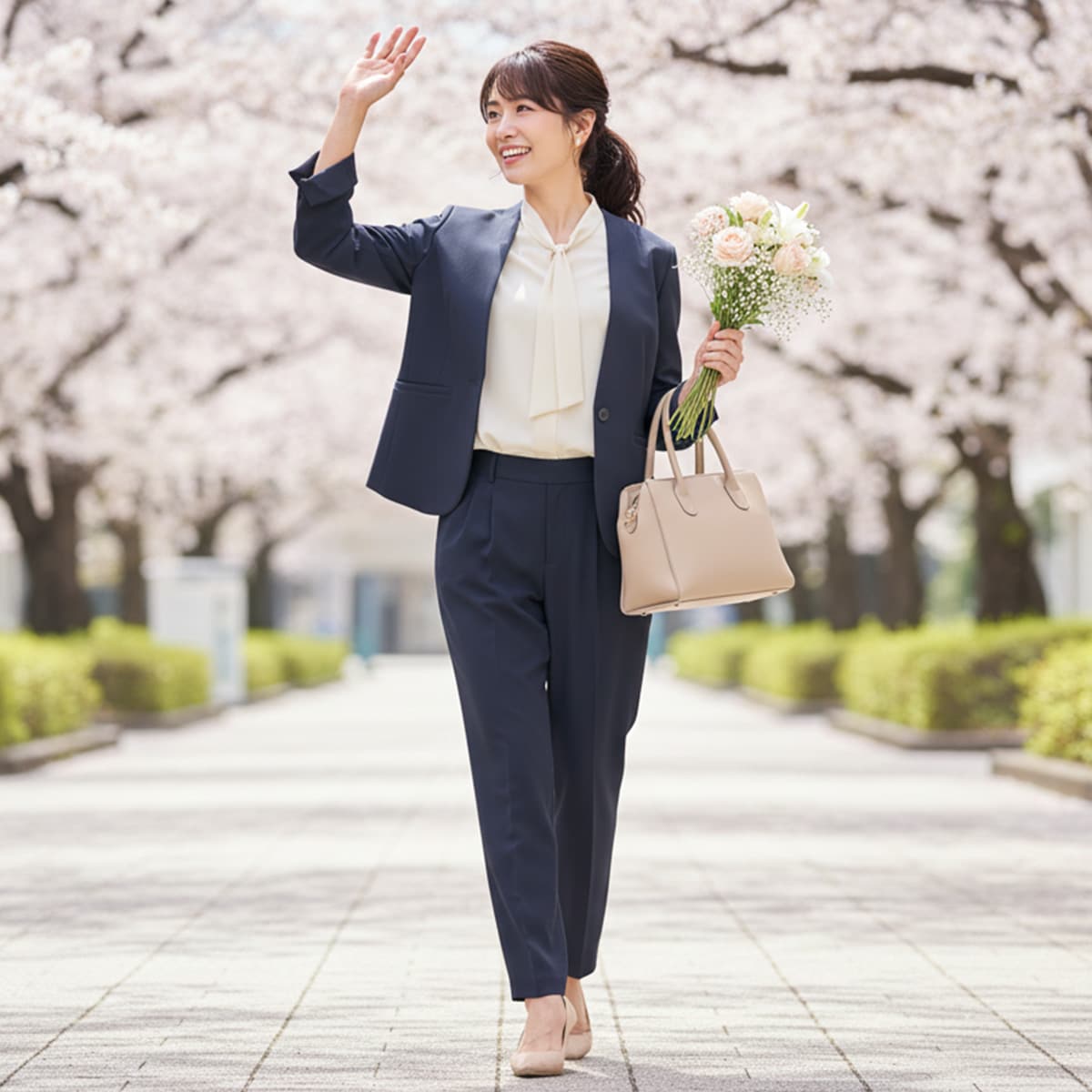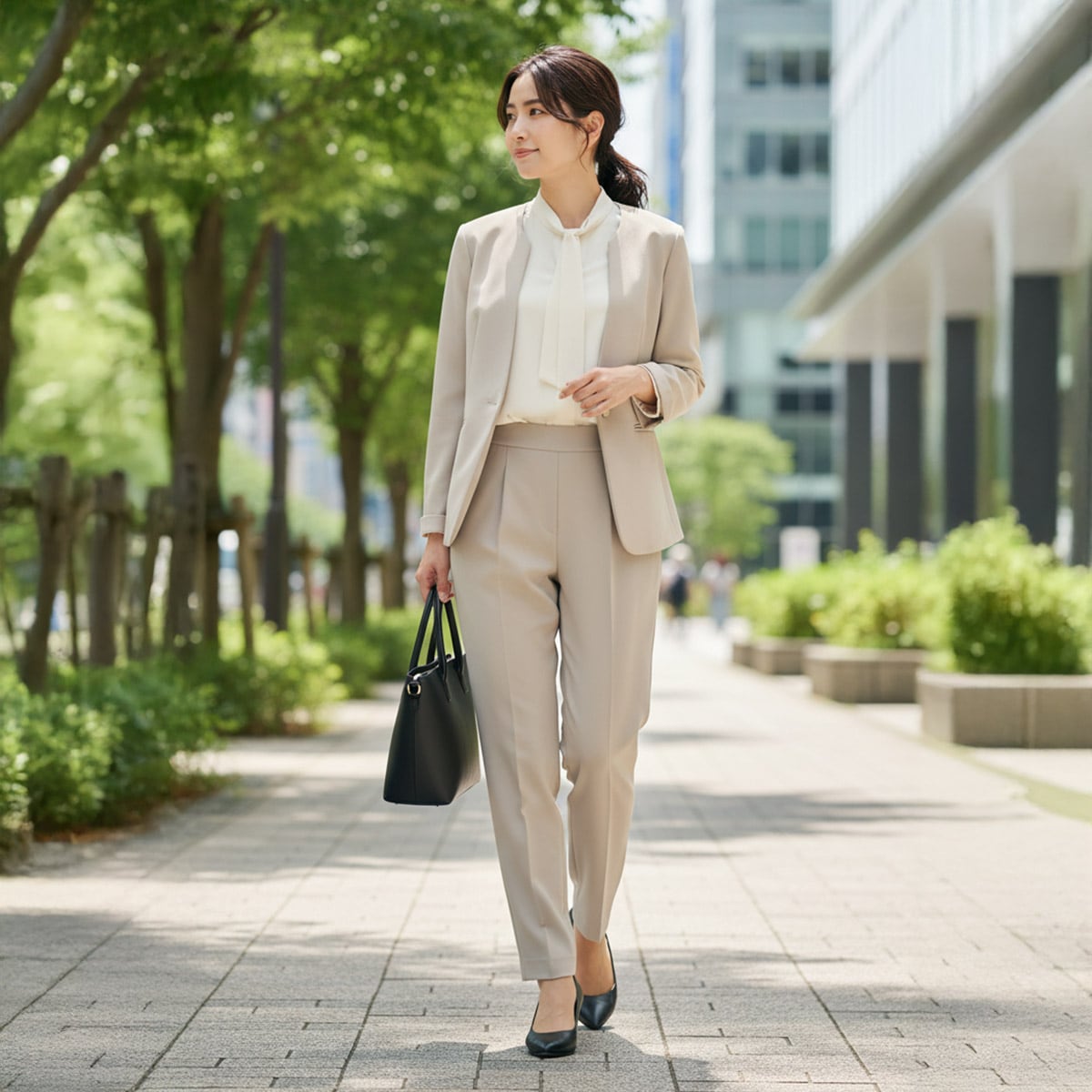 気品あるセットアップで颯爽と軽やかに。白いブラウスと合わせても。
