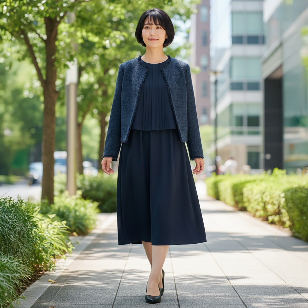 一枚でもセットアップ見えして着回しやすく、上品な印象です。