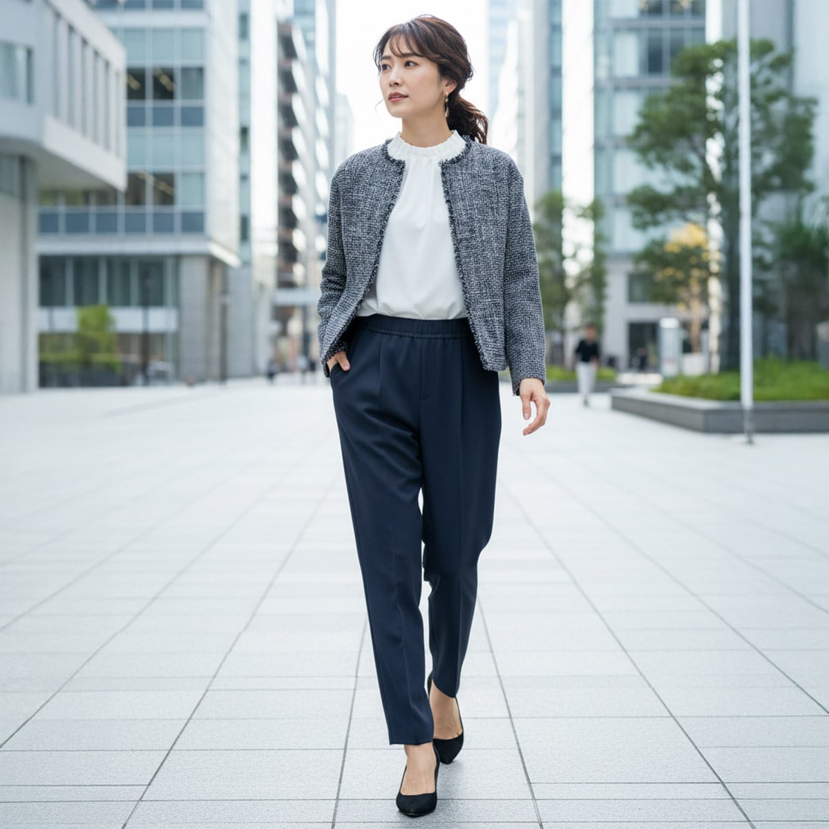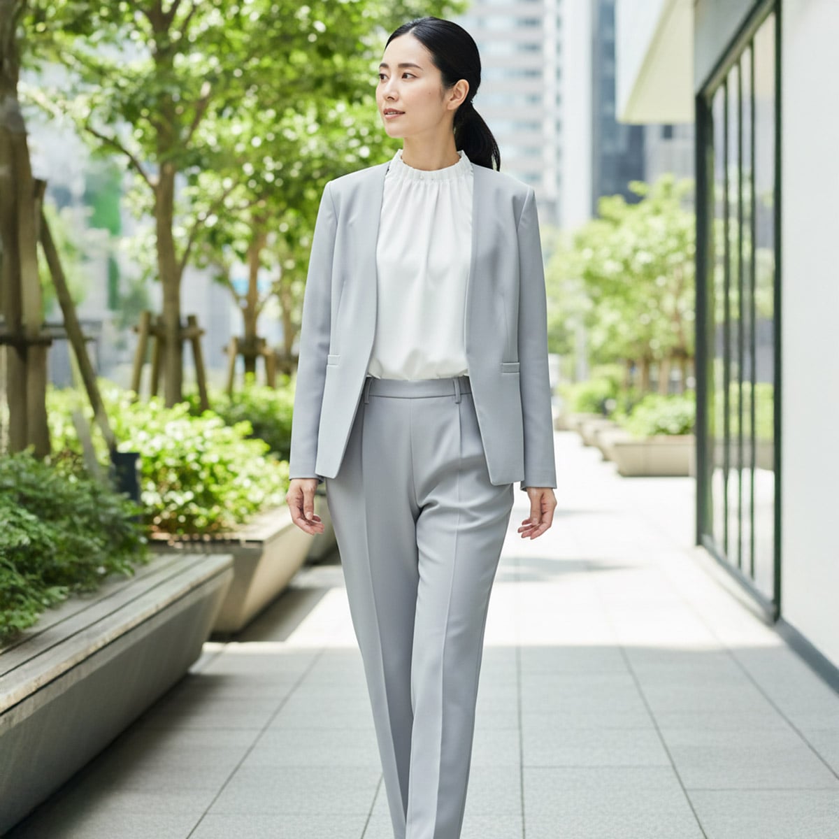 清潔感と上品さがあり、ビジネスシーンでスマートで洗練された印象を与えてくれます。ゆるやかなテーパードシルエットとセンタープレスでスラリ美脚見え。程よいストレッチでどんな動きもスムーズ。