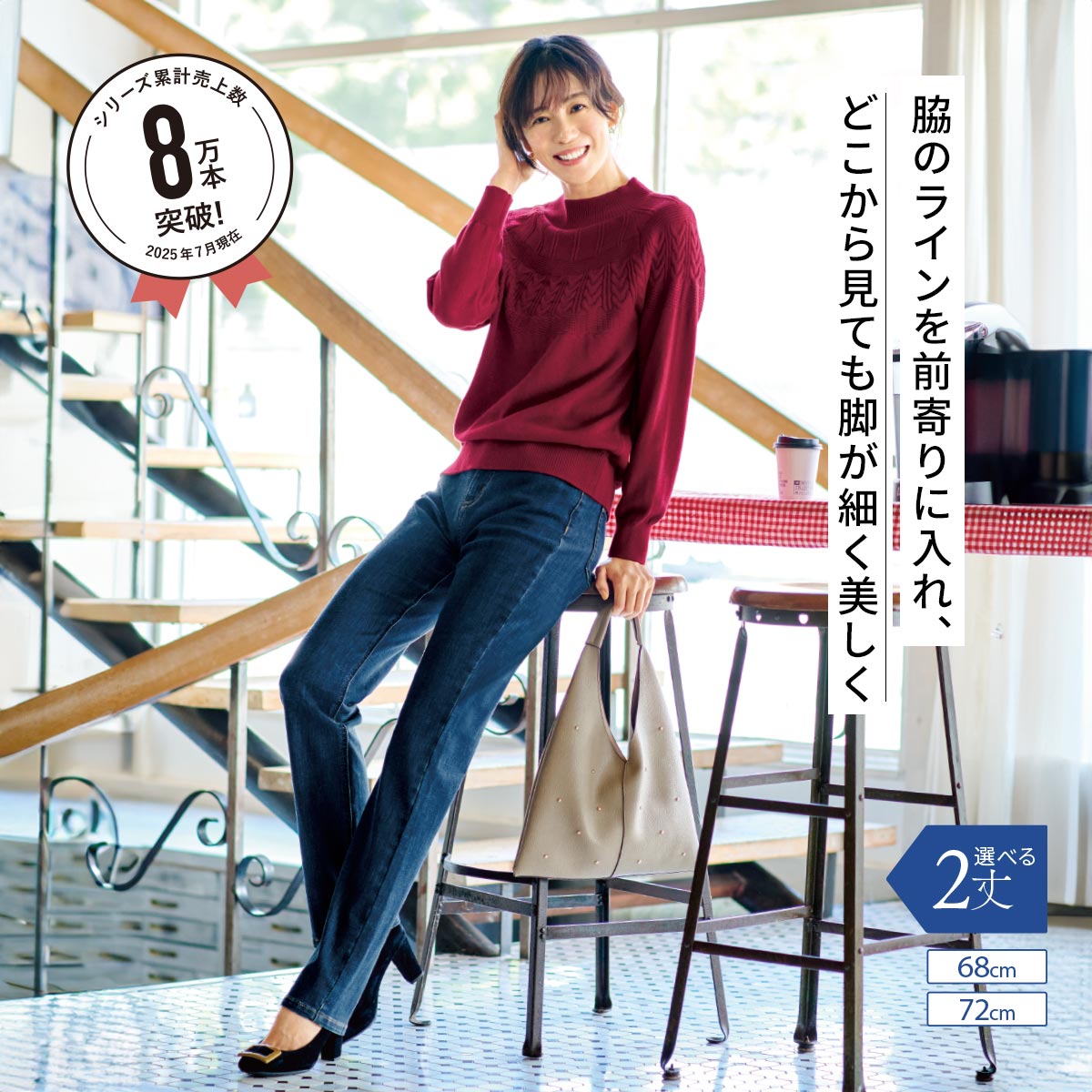 深めの股上設計なので、安心のはき心地なのに視覚効果で脚長に!本格デニムでありながら驚くほど履きやすく、感動の履き心地!