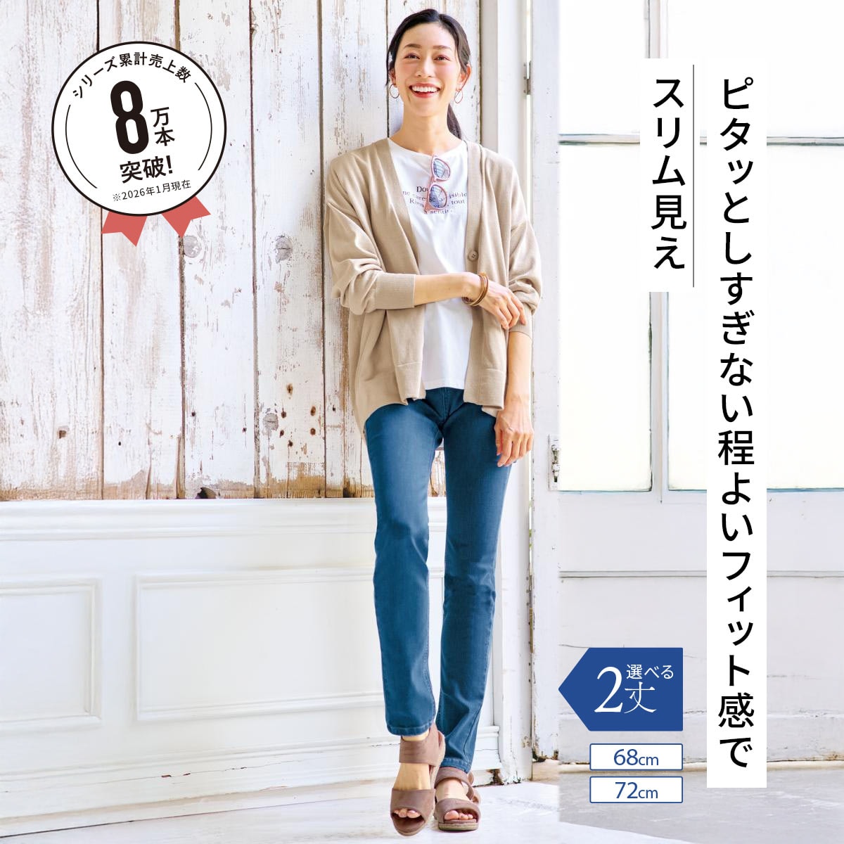深めの股上設計なので、安心のはき心地なのに視覚効果で脚長に!本格デニムでありながら驚くほど履きやすく、感動の履き心地!