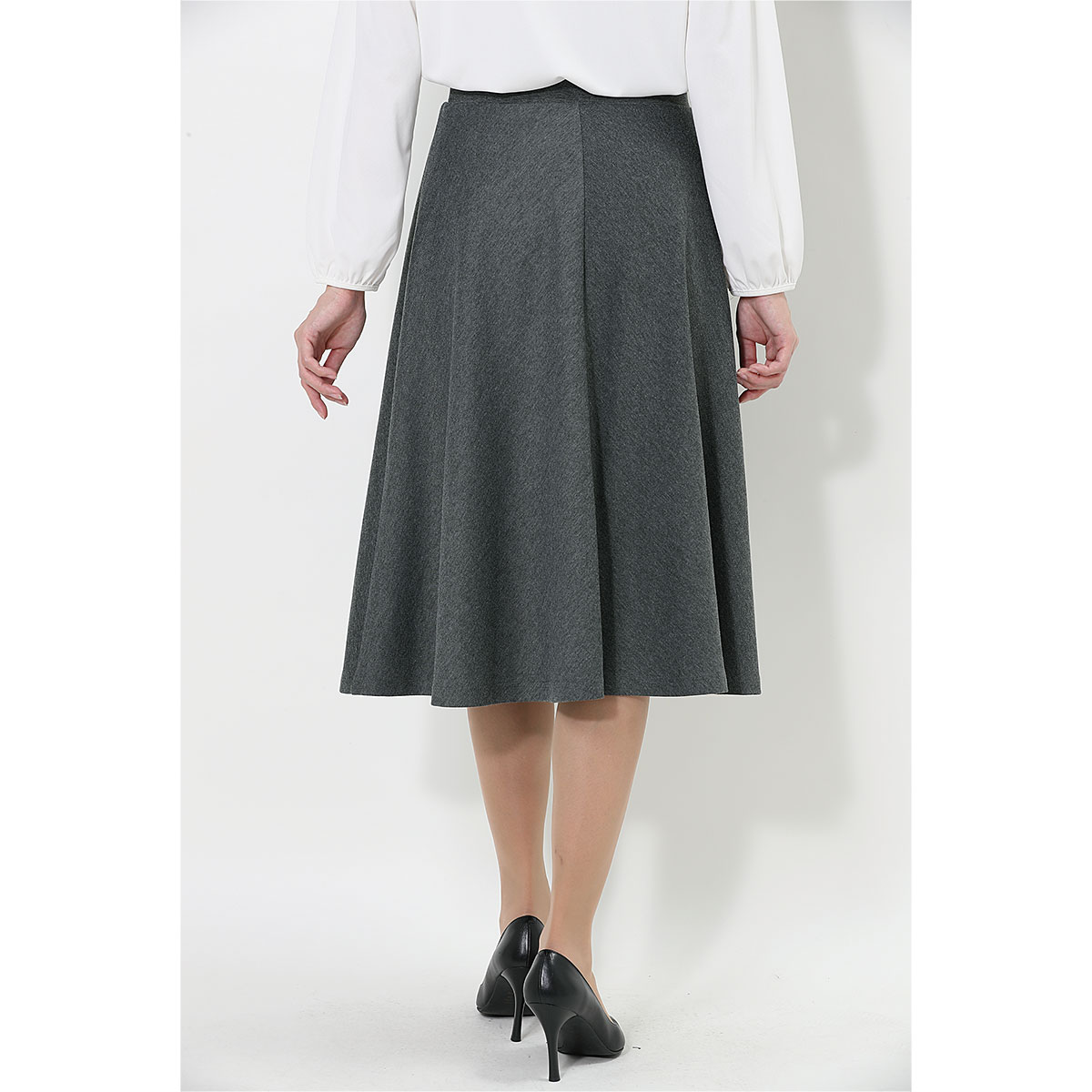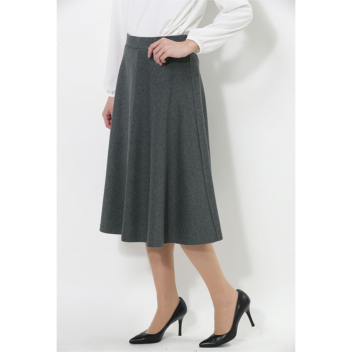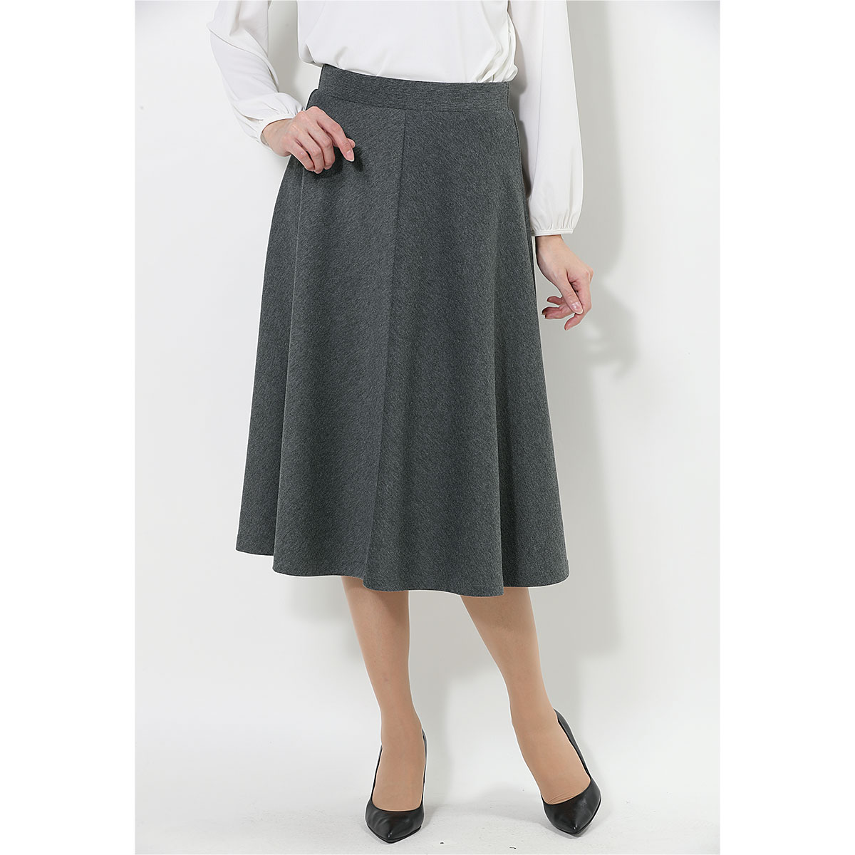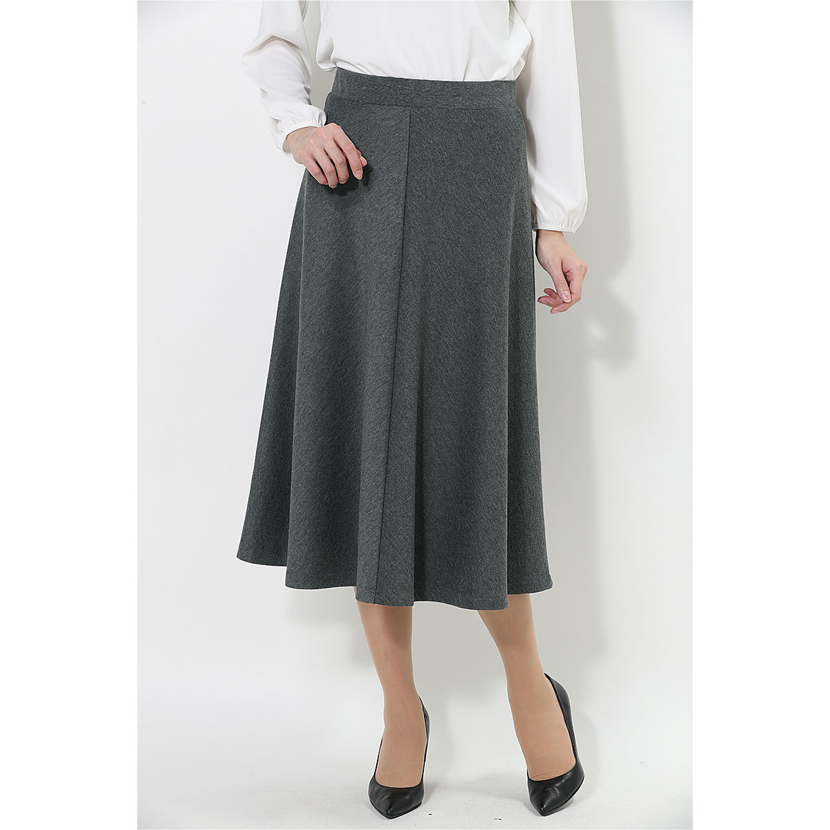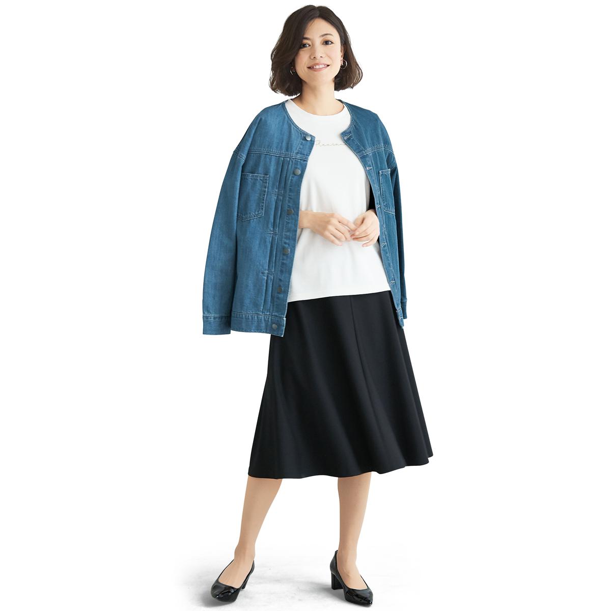 -お買い得ポイント-着まわしやすくきちんと感があるので、オンオフ使い分けできる優秀アイテムです。スカート丈はお好みで選べる2種類の膝下丈をご用意しています。ご家庭の洗濯機で洗えるのもうれしいポイント。-デザイン-ゆるやかなフレアがきれいなボリューム感を演出する4枚はぎで、コーディネートしやすい上品なシルエット。ウエストは総ゴム仕様に見えないフラットなつくりで、ラクなはき心地とスマートな見た目を両立させました。-素材特徴-程よい肉厚感とストレッチ性があり、はき心地のよいやわらかなカットソー