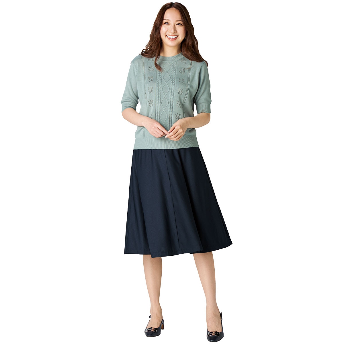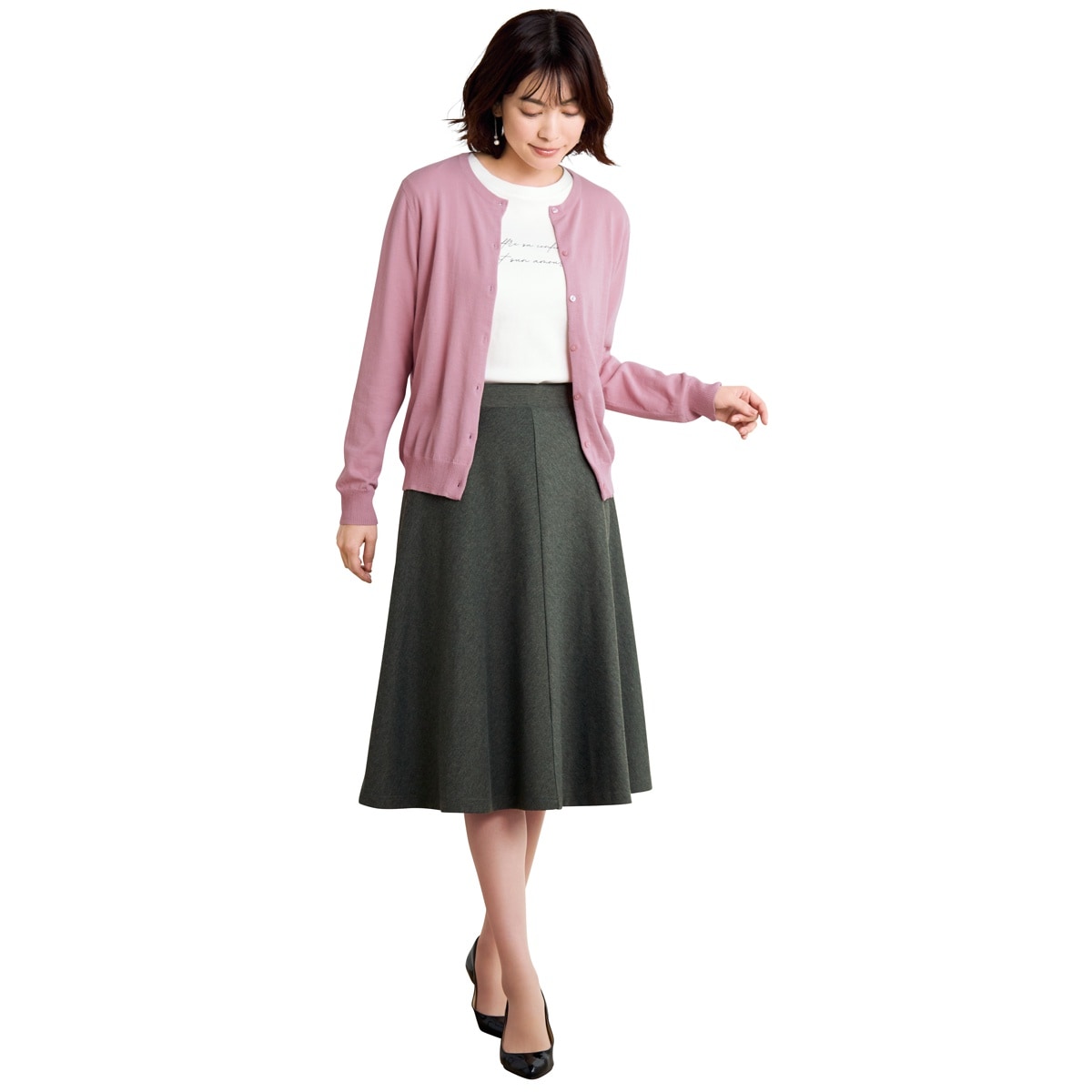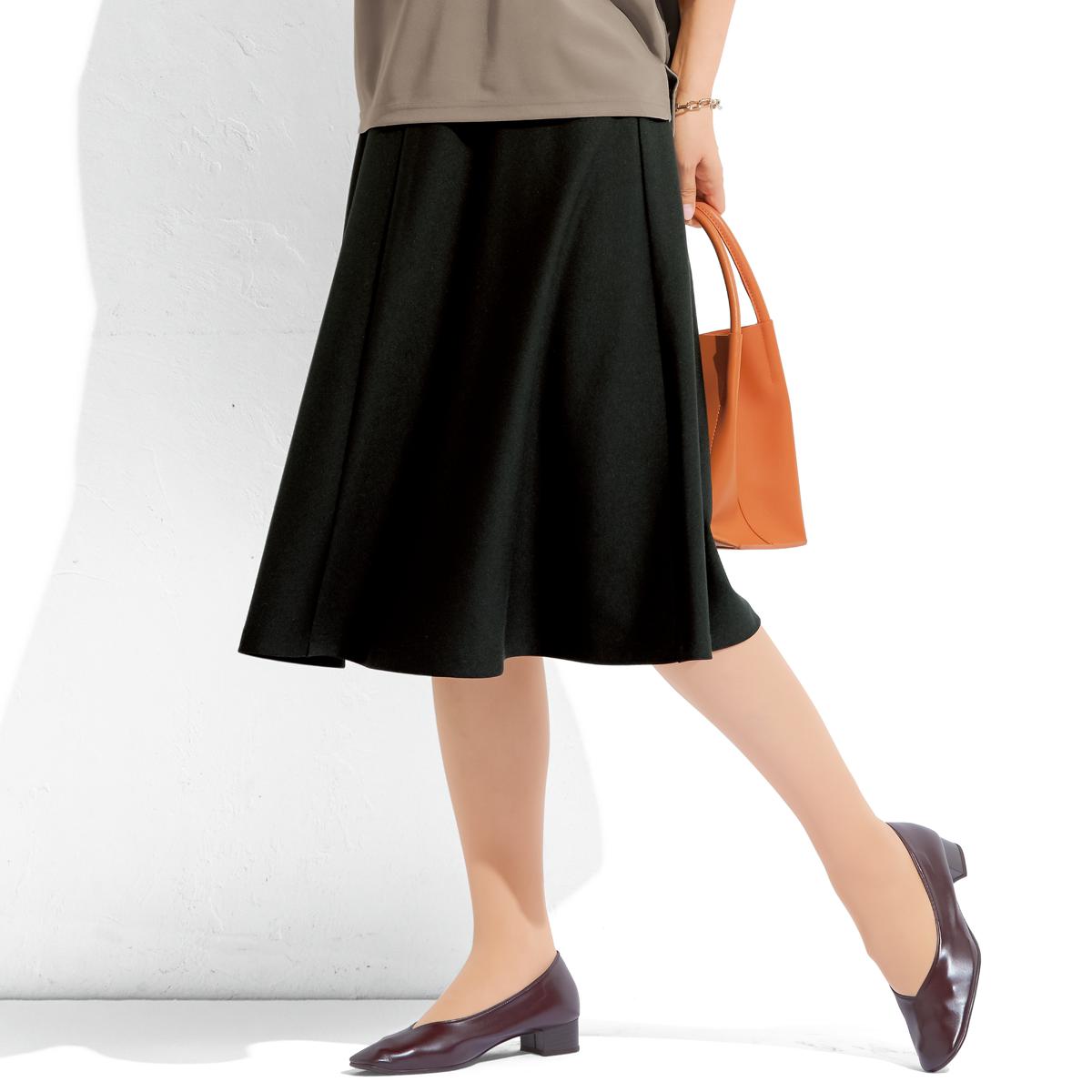 -お買い得ポイント-着まわしやすくきちんと感があるので、オンオフ使い分けできる優秀アイテムです。スカート丈はお好みで選べる2種類の膝下丈をご用意しています。-デザイン-ゆるやかなフレアがきれいなボリューム感を演出する4枚はぎで、コーディネートしやすい上品なシルエット。ウエストは総ゴム仕様に見えないフラットなつくりで、ラクなはき心地とスマートな見た目を両立させました。-素材特徴-程よい肉厚感とストレッチ性があり、はき心地のよいやわらかなカットソーです。