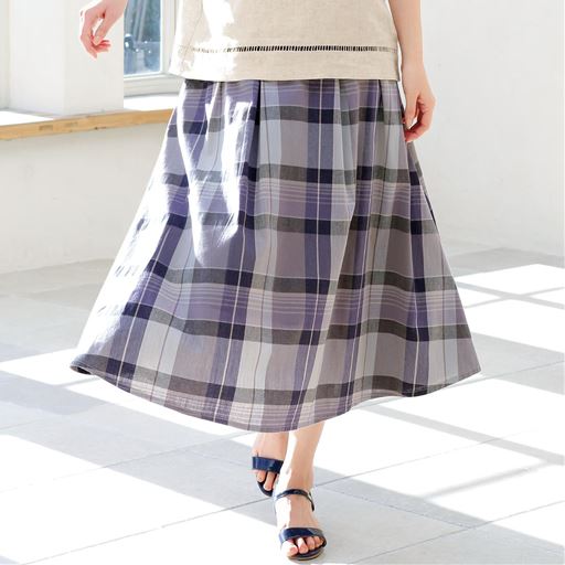 たっぷりのフレアで主役級の存在感を発揮する綿100%スカート。腰まわりがもたつかないよう、ウエスト下のタックを中縫いすることで広がりを抑えお洒落に仕上げました。大胆なチェック柄やシックな配色のストライプで、着映え力UP!後ろ中心ゴム仕様のファスナー開き、綿混素材の裏地付きで、暑い日も快適に過ごせます。