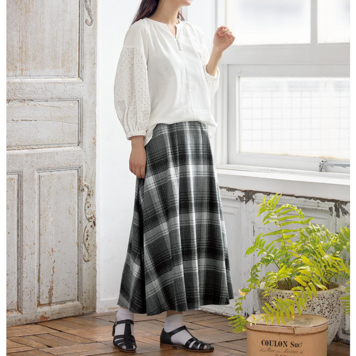 -ポイント-やさしく落ち着いたチェック柄とシンプルな無地で仕立てた、ふんわり可愛らしいスカート。ナチュラルな印象で、コーデを彩ります。-デザイン-お腹周りをスッキリ見せるフレアシルエット。ウエストは総ゴム仕様で、スピンドル入りだから窮屈感なく楽にはけます。-素材特徴-ふっくらとしたやわらかな風合いで、温かみを感じさせる起毛素材。綿混だから肌ざわりもやさしく、裏地のついたストレッチカットソー素材で、まとわりつきにくく動きやすい。