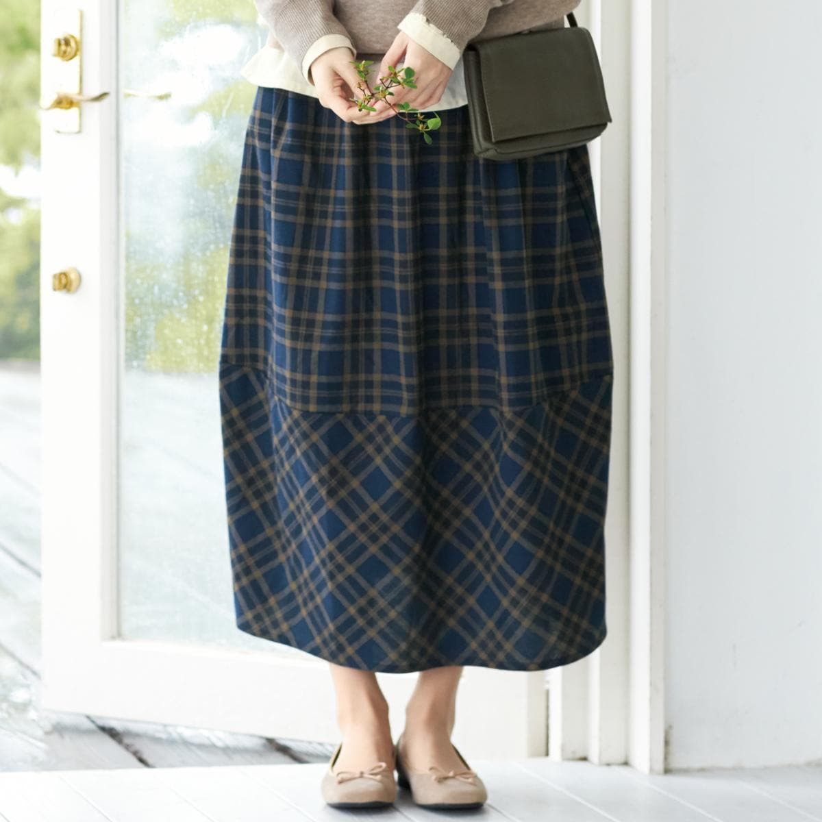 ■ポリエステル65%綿35%(平織表起毛)裏地あり●ウエスト後ろゴム仕様・両脇ポケット▼素材のもつ特徴としてネップなどが生地の表面にみられます▼チェック柄は、商品によって柄の位置が異なります●洗濯機OK●中国製