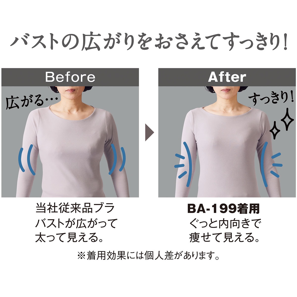 シリーズ累計販売枚数19.5万枚突破!(2025年8月現在)バストが下がって広がると、ポッチャリ太って見える原因に!スレンダーフィット®ブラは、大きなサイドパネルで広がりをおさえ窮屈感なくすっきり着やせバストに。バストトップを内向きに設計したカップで更にすっきり整えます。安定感がありつつ、アンダー全体が伸びる設計や、脇~背中はゴムのない折り返し仕様で窮屈さを軽減。気になる背中のボコボコ段差も防ぎます。深めの3/4カップで安定感も人気のヒミツ。お揃いのショーツ(品番:EC-201)とコーデも楽しめます。