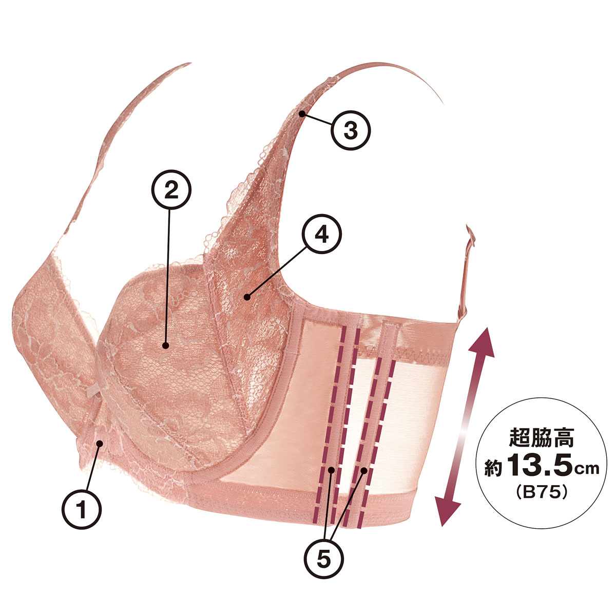 (1)幅広ストラップで肩がラク。(2)ストラップとつながるサイドパネルが寄せたバストを引き上げる。(3)2本のボーンで脇をしっかりおさえる。(4)超脇高(B75:約13.5cm)で脇すっきり。