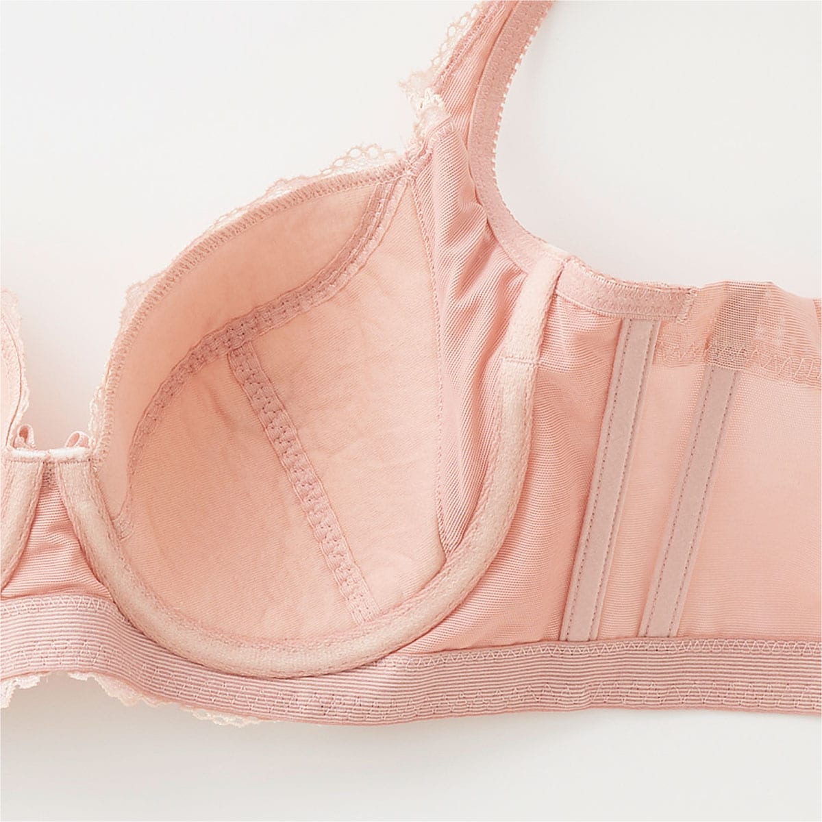 カップ裏は、綿混素材。パッドなしでバストもすっぽり包みこむフルカップ。ストラップにつながるサイドパネルで寄せたバストをグッと引き上げます。
