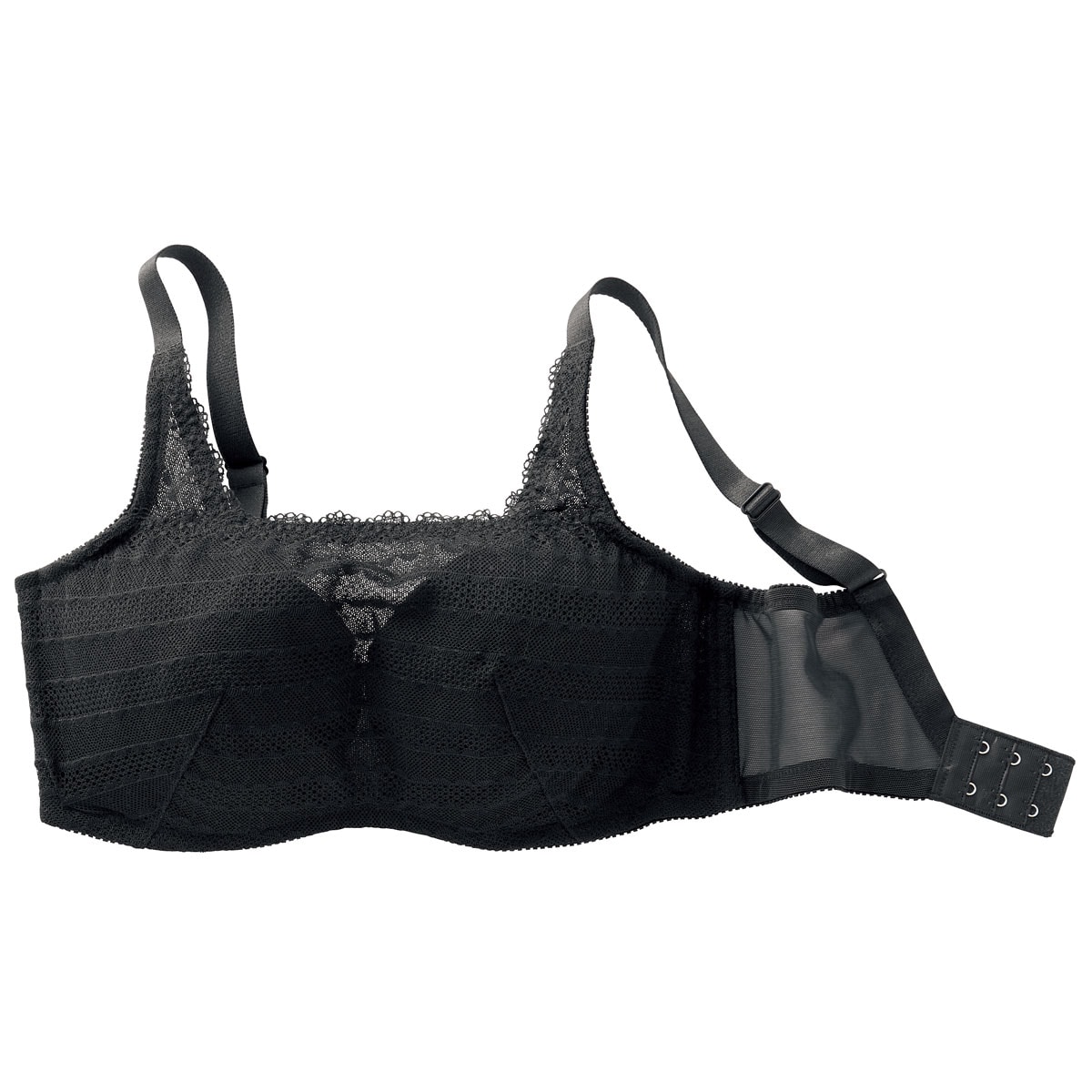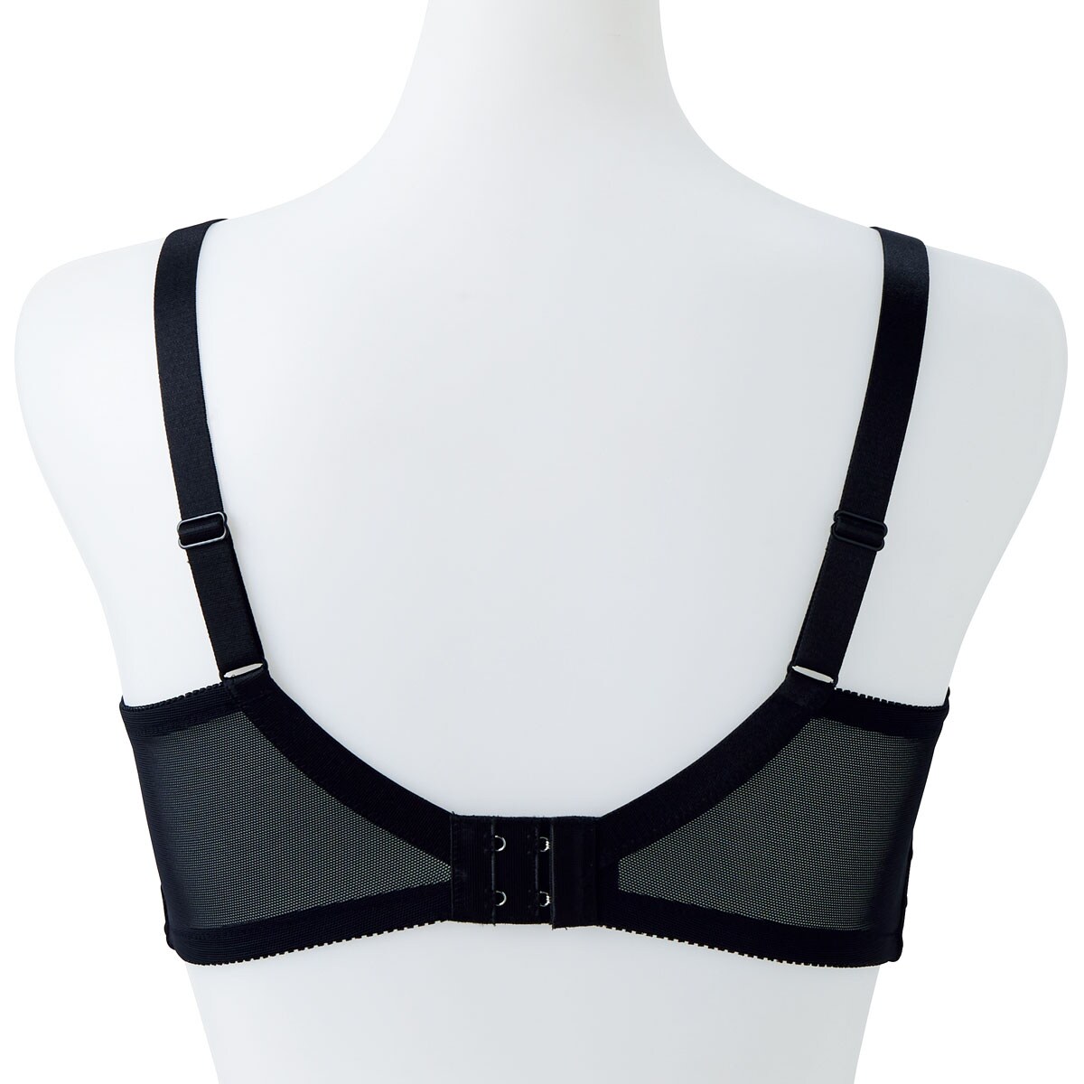 ブラック/両脇から絞り込み、バストを逃さずカップに入れ、表のレース+パワーネットでさらにおさえ込む。