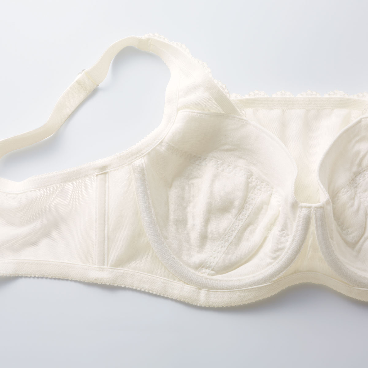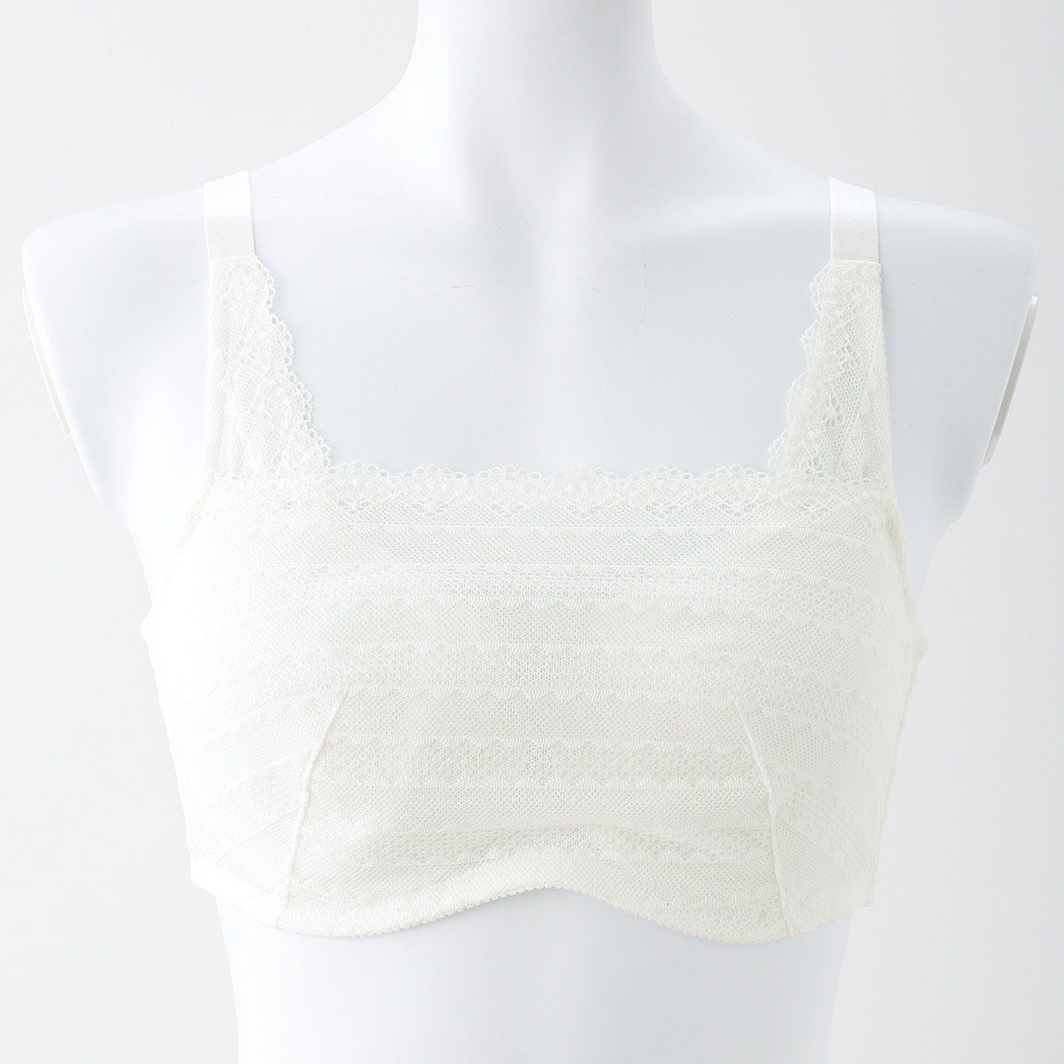 まるでさらしを巻いたように、グラマーバストをとことん小さく見せるブラ。乳間を狭くした1枚布で両脇からバストを絞り込み、逃さずカップに入れ込むから、すっきりボリュームダウン。両脇から続くカップ表布でバストを押さえ込んでサイドもすっきり整えます。ワイヤー入りで安定感のある着け心地。胸元はアウター風のエレガントなレース仕様で谷間をカバーしながら、おしゃれな見せブラとしてコーディネートにも使えます。