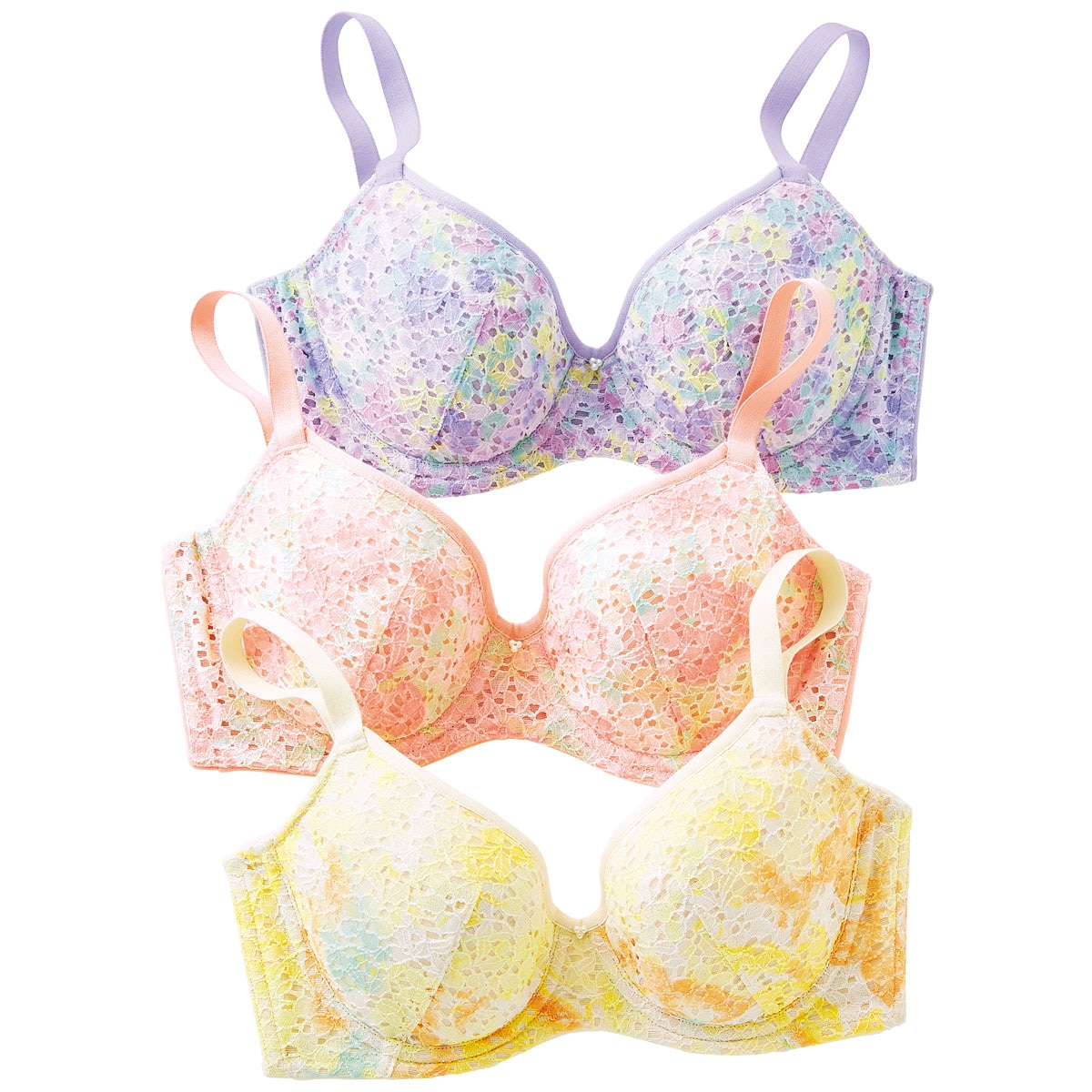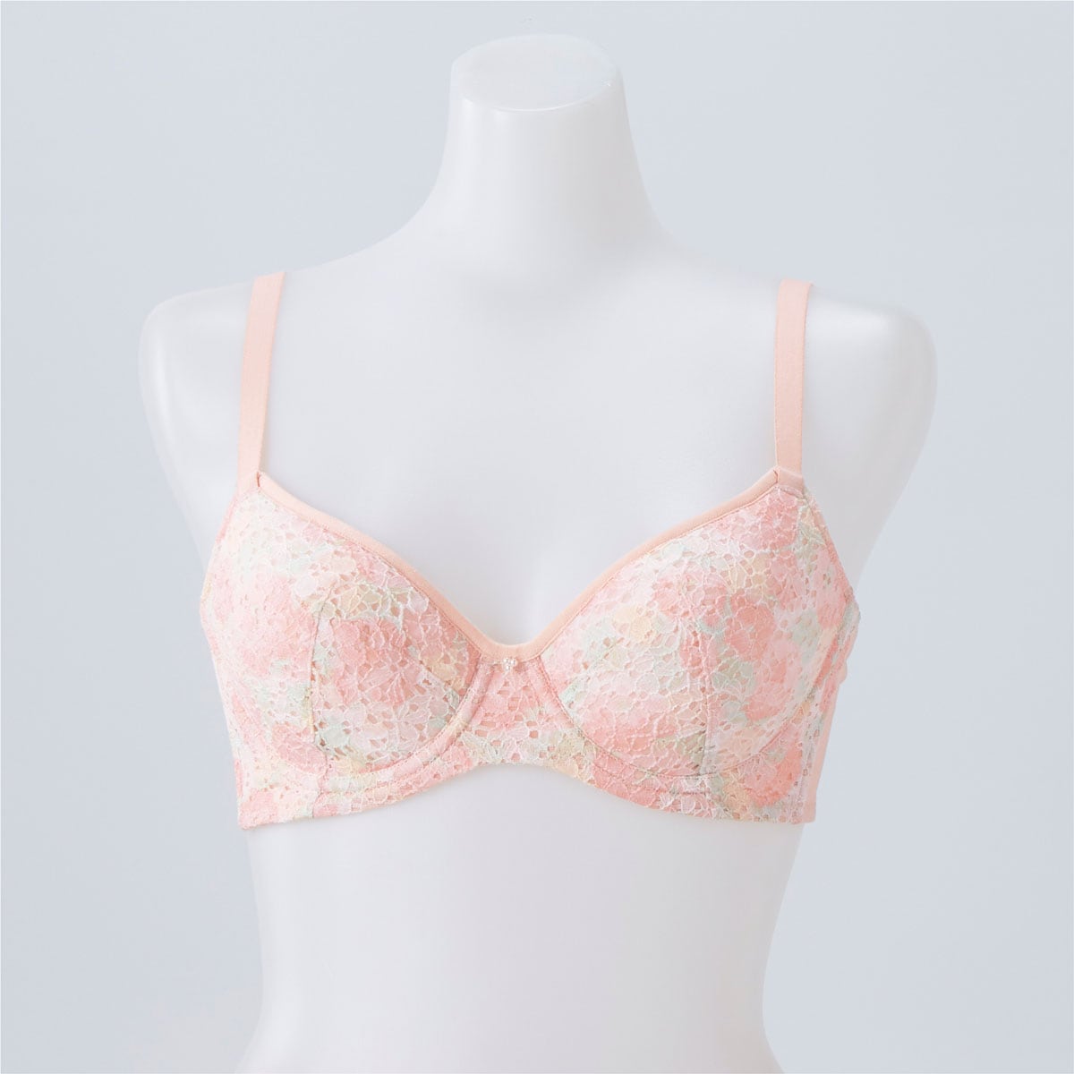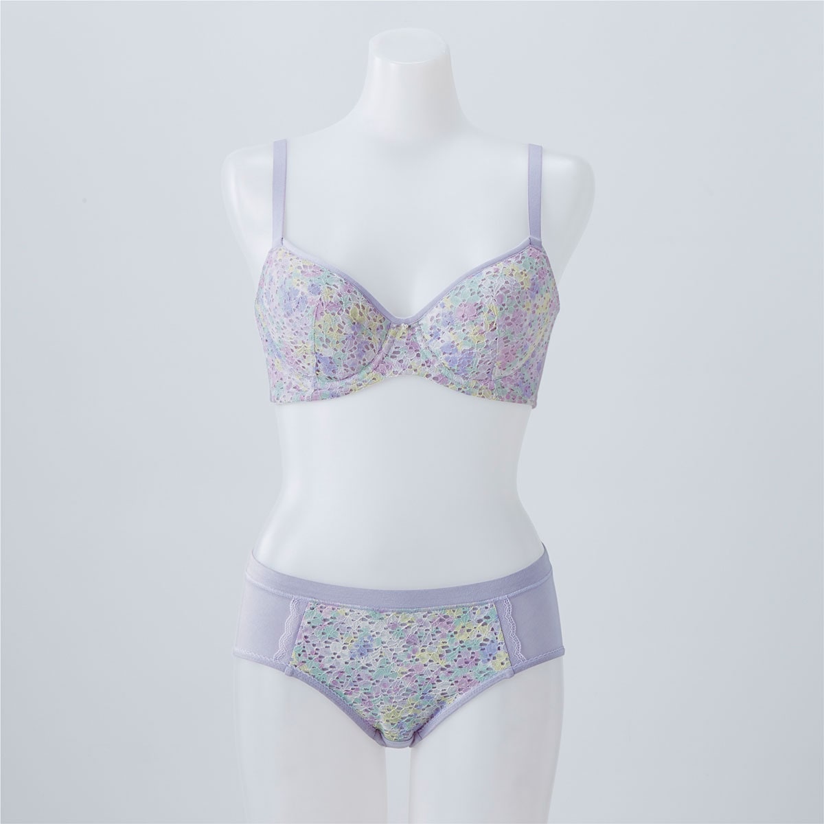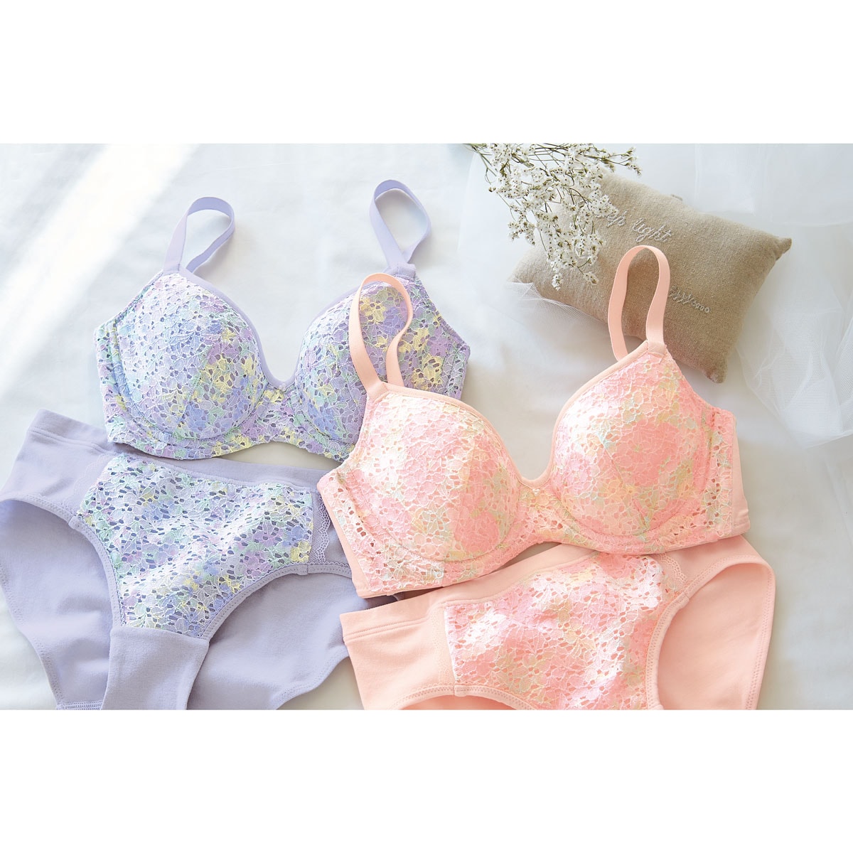 ブラのかゆい、痛い、苦しいにさようなら!肌にやさしい綿混素材でくるんだコットンブラ「Tシャツみたいなブラ®」。ワイヤー、ボーン、ゴムはすべて綿混生地でくるみ、縫い目もほとんど肌側に出さないやさしさ仕上げで、低刺激な着け心地。ストラップも肌側綿100%で肌あたりがやさしく、かたくて痛い縫い付け部分もカップの外側に。チクチクしやすい洗濯タグがないプリント仕様。また、脇のはみ肉をカバーする脇高設計で、すっきり段差レスなシルエットに整えます。ショーツとのコーデも楽しめる、パステル調の可憐なデザインです。