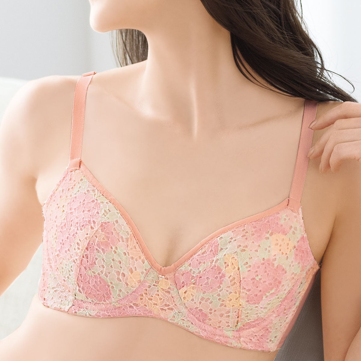 ブラのかゆい、痛い、苦しいにさようなら!肌にやさしく低刺激な着け心地のコットンブラ「Tシャツみたいなブラ®」。ワイヤー、ボーン、ゴムはすべて綿混生地でくるみ、縫い目もほとんど肌側に出さないやさしさ仕上げ。ストラップも肌側綿100%で肌あたりがやさしく、かたくて痛い縫い付け部分もカップの外側に。チクチクしやすい洗濯タグはプリント仕様にし、脇のはみ肉をカバーする脇高設計で、すっきり段差レスなシルエットに整えます。ショーツとのコーデも楽しめる、可憐なデザインです。