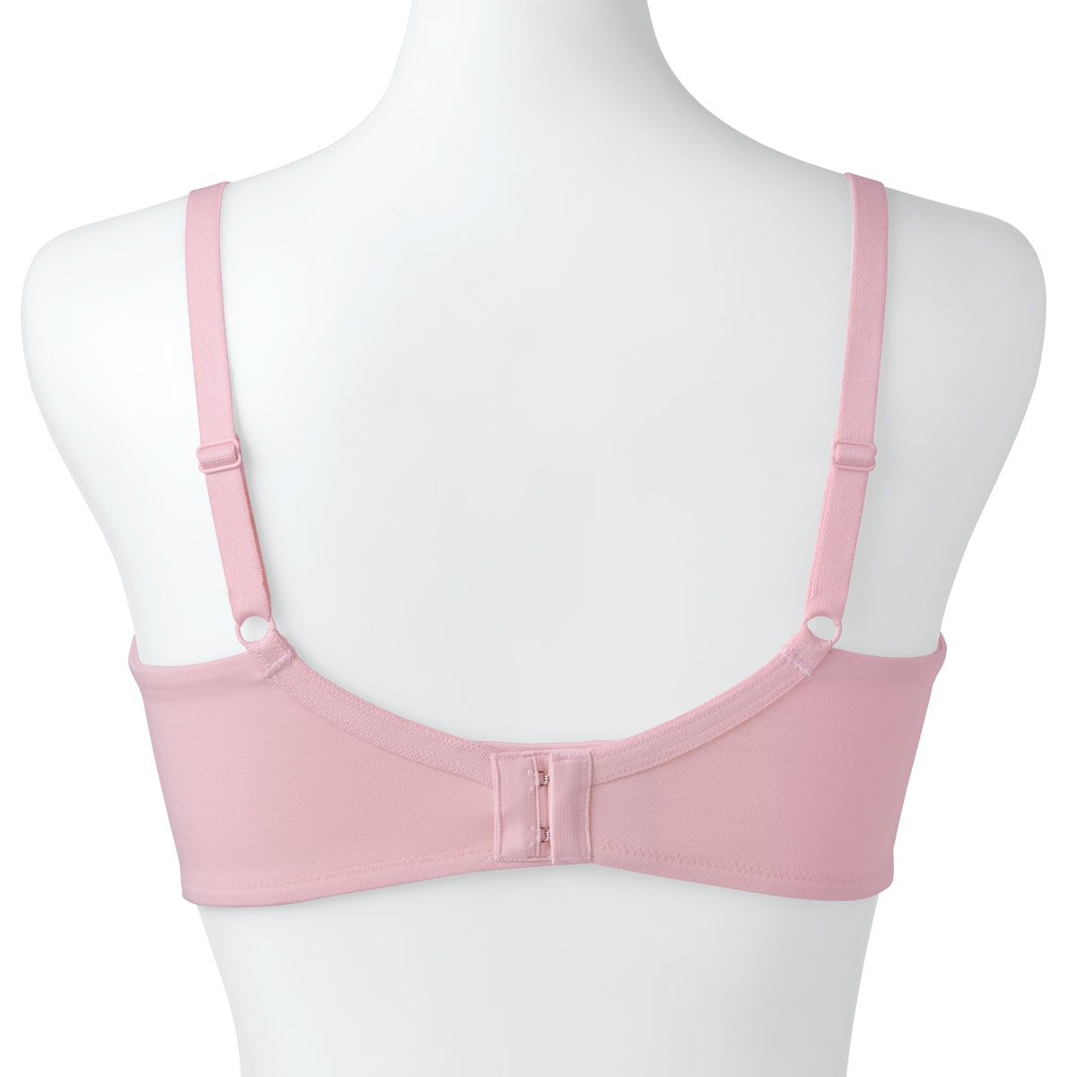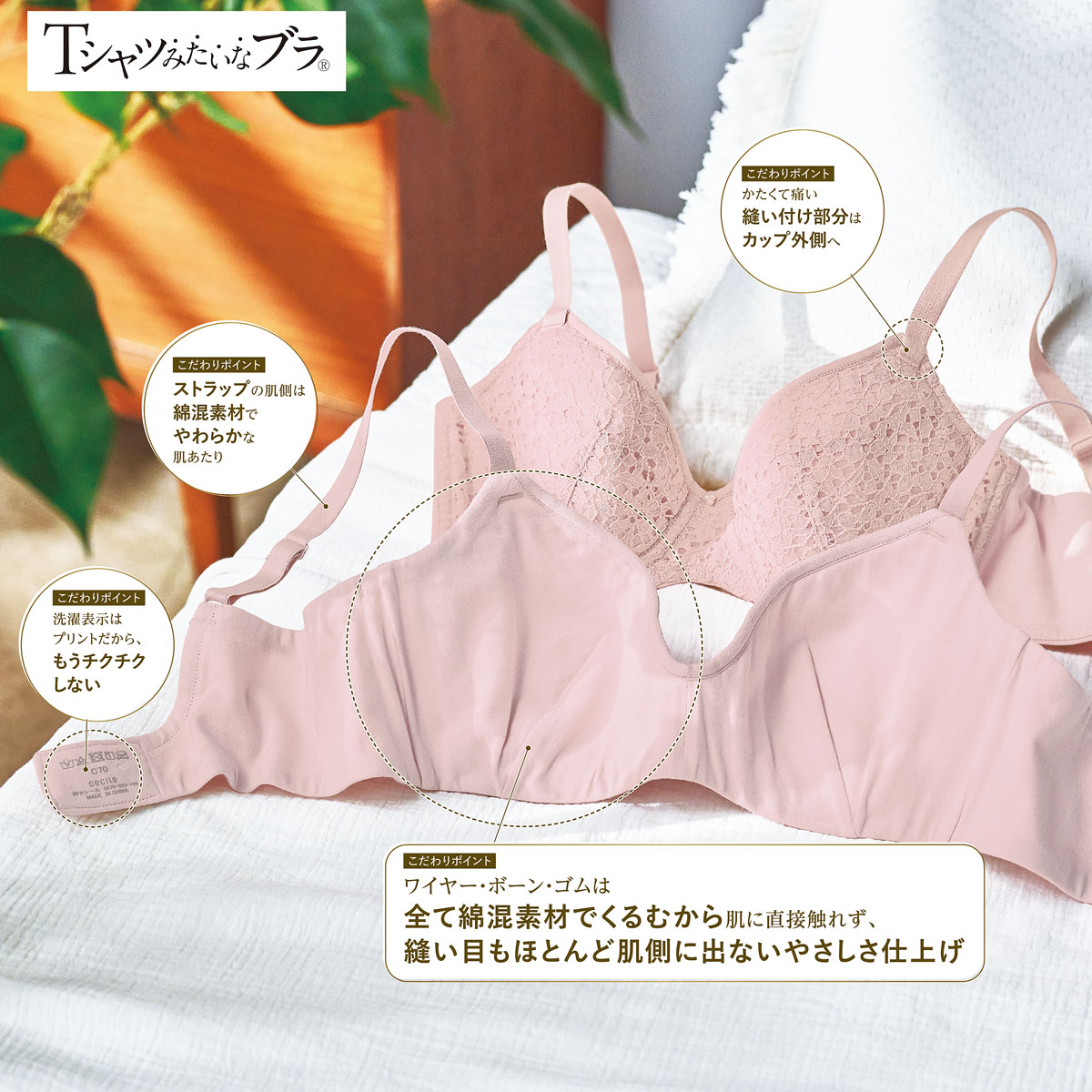 Tシャツみたいなブラ®のこだわりポイント(1)ストラップの肌側は綿100%でやわらかな肌あたり(2)かたくて痛い縫い付け部分はカップ外側へ(3)チクチクして不快な洗濯ネームはプリントに(4)肌側は綿混素材でくるんだやさしさ仕上げワイヤー、ボーン、ゴムは全て生地でくるみ、縫い目もほとんど肌側に出ないので低刺激。