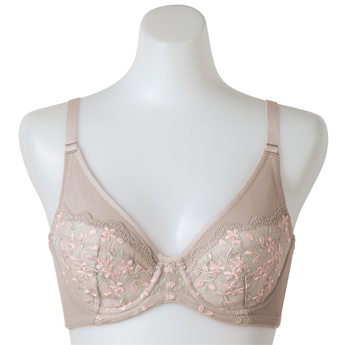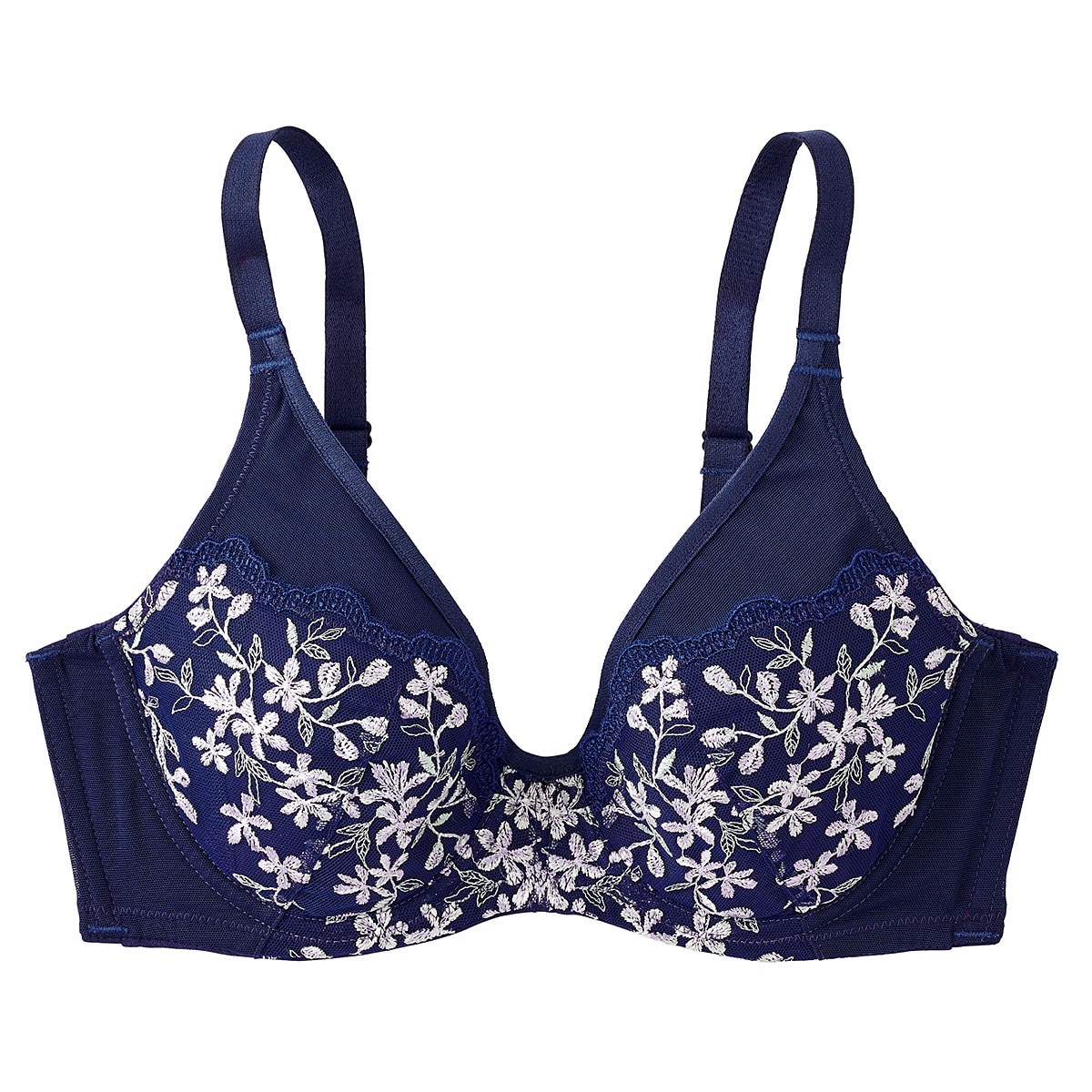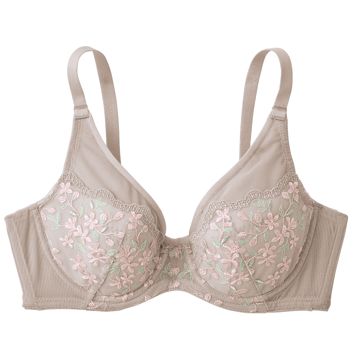肌側はすべて綿混素材の肌にやさしい「Tシャツみたいなブラ®」のフルカップタイプ。やわらかくなってきたお肉もすっぽり包んですっきり安定。やや薄手のカップでバストになじみやすく、表側に使ったソフトなパワーネットでボリュームのあるバストもやさしく支え、広がりも防ぎます。バストの横流れやはみ肉を防いですっきり整える脇高設計。幅広ストラップで肩がラクちん。花柄レースをあしらったナチュラルで可愛いデザインにもこだわりました。