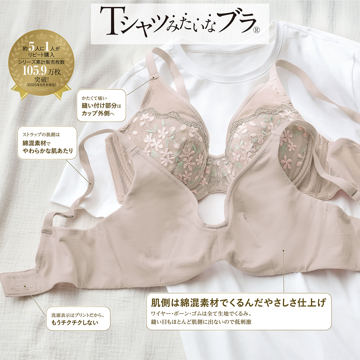 【シリーズ累計販売枚数105.9万枚突破!(2025年8月現在)】ブラジャーの「かゆい」「痛い」にさようなら!肌ざわりのやさしい綿混素材にこだわったTシャツみたいなブラ®フルカップタイプ(超ソフトワイヤー入り)