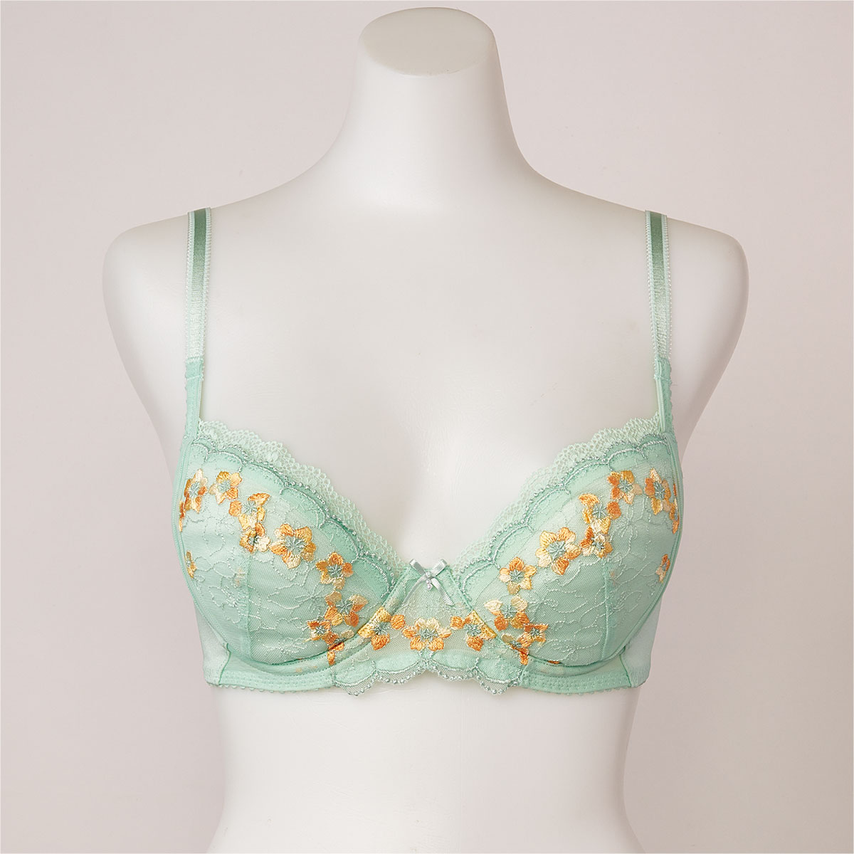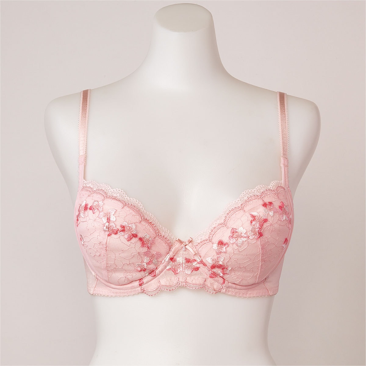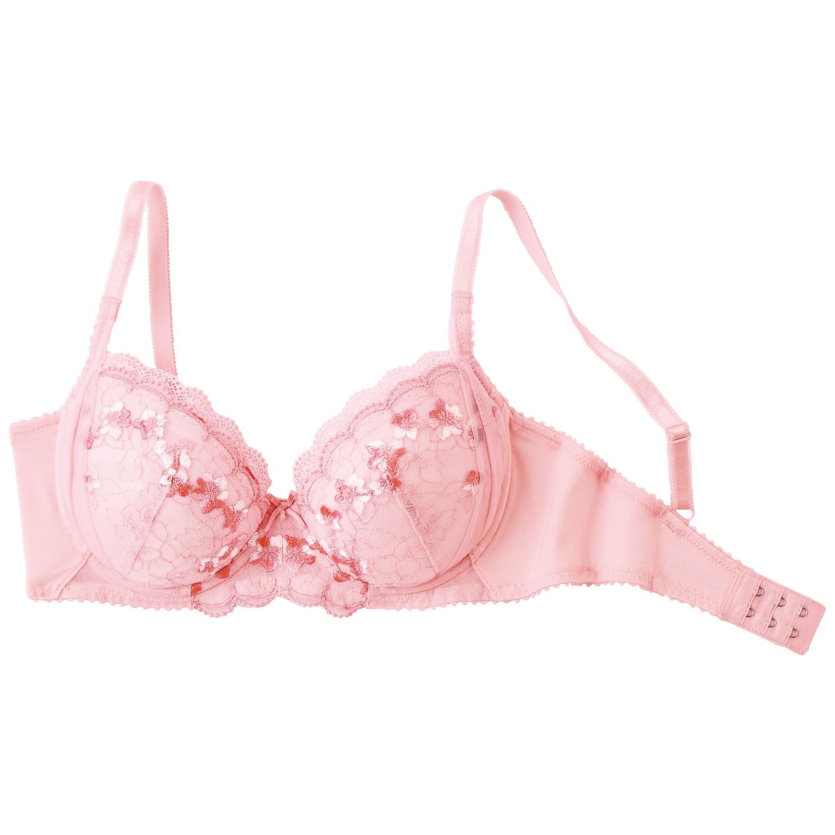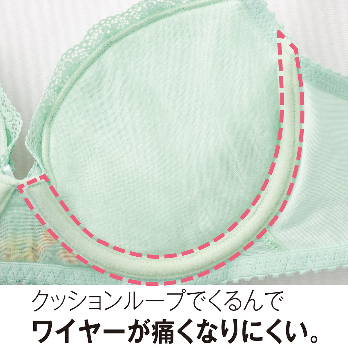 セシール内最厚となる約28mmのカップで、小さめバストをしっかり盛胸メイク。プチ胸さんに人気のブラが、より着け心地よくなって登場です。上カップにほどよくなじむストレッチシートを使用し、上辺のフィット感がぐぅんとアップ。気になる段差を軽減しました。レース自体もよく伸びてバストにフィットし、やや深めカップがバストをキレイに包むから安定感もアップ。豪華な刺繍レースが気分も華やかにしてくれます。ワイヤーをクッションループでくるんだ痛くなりにくいタイプ。