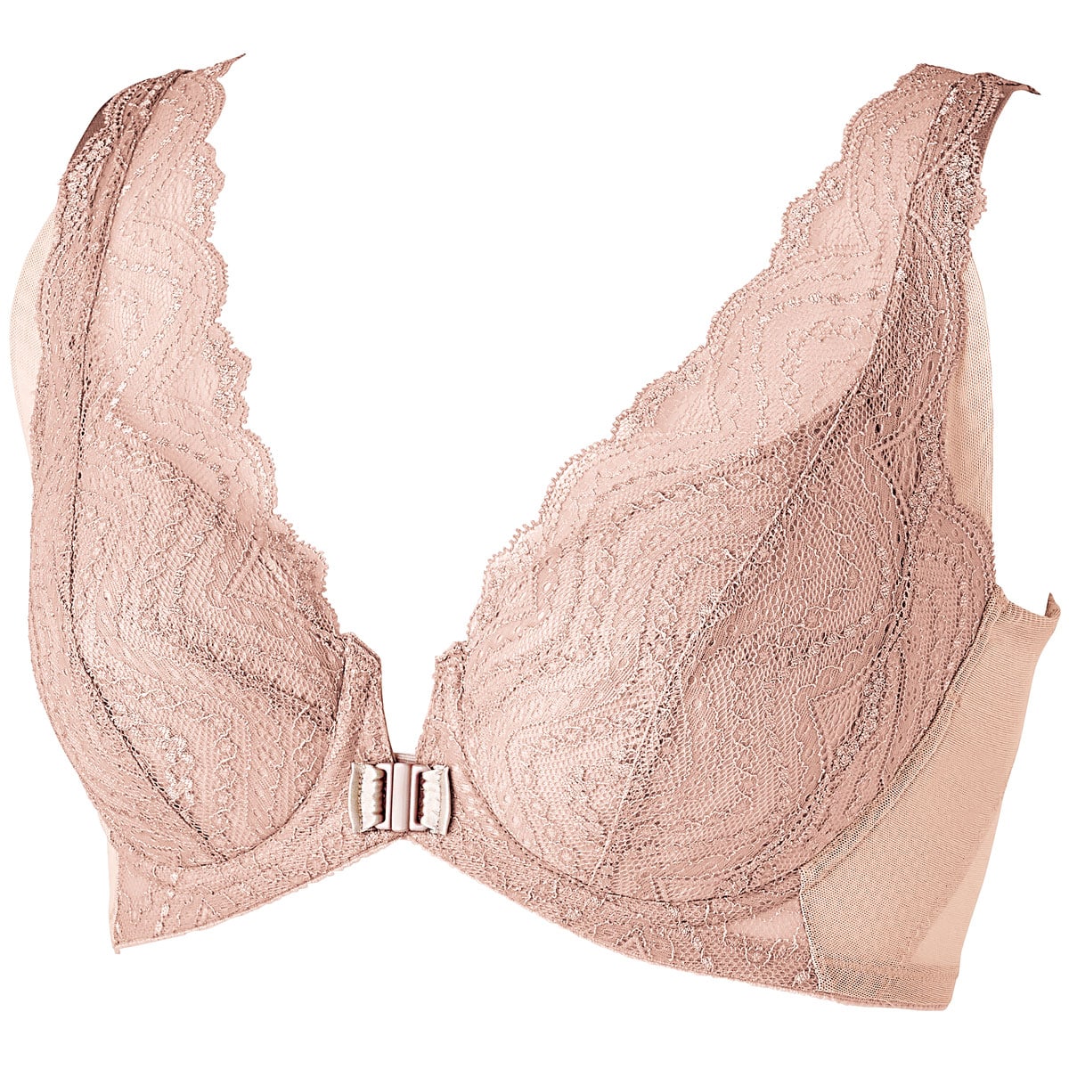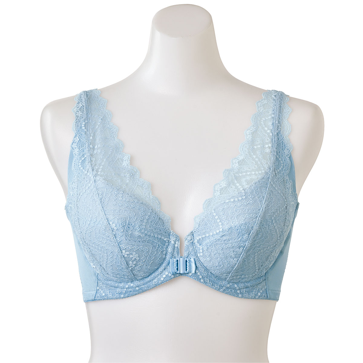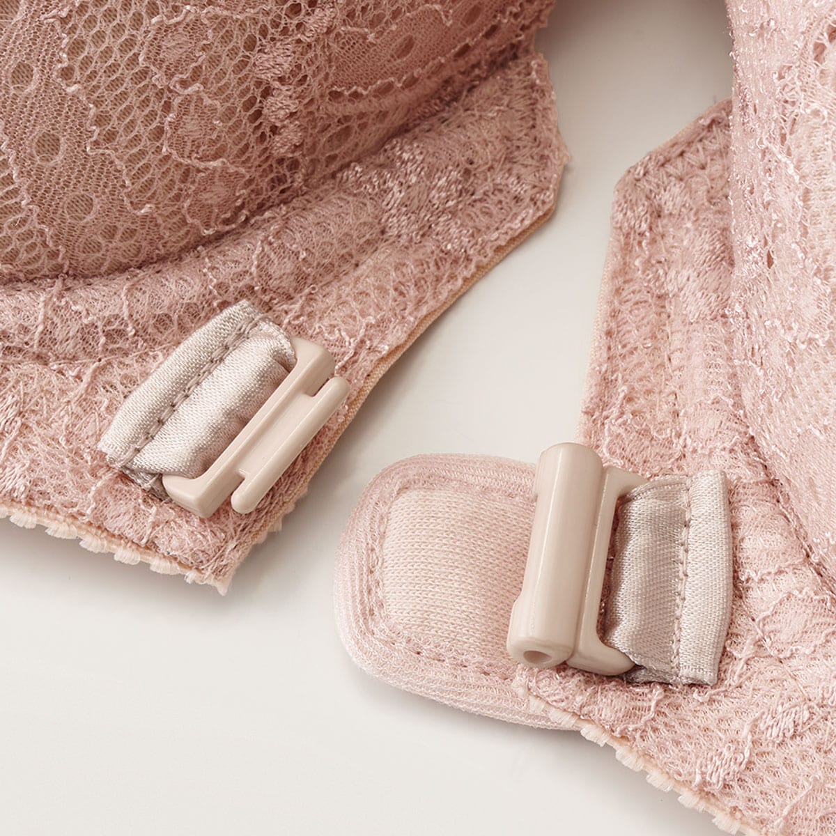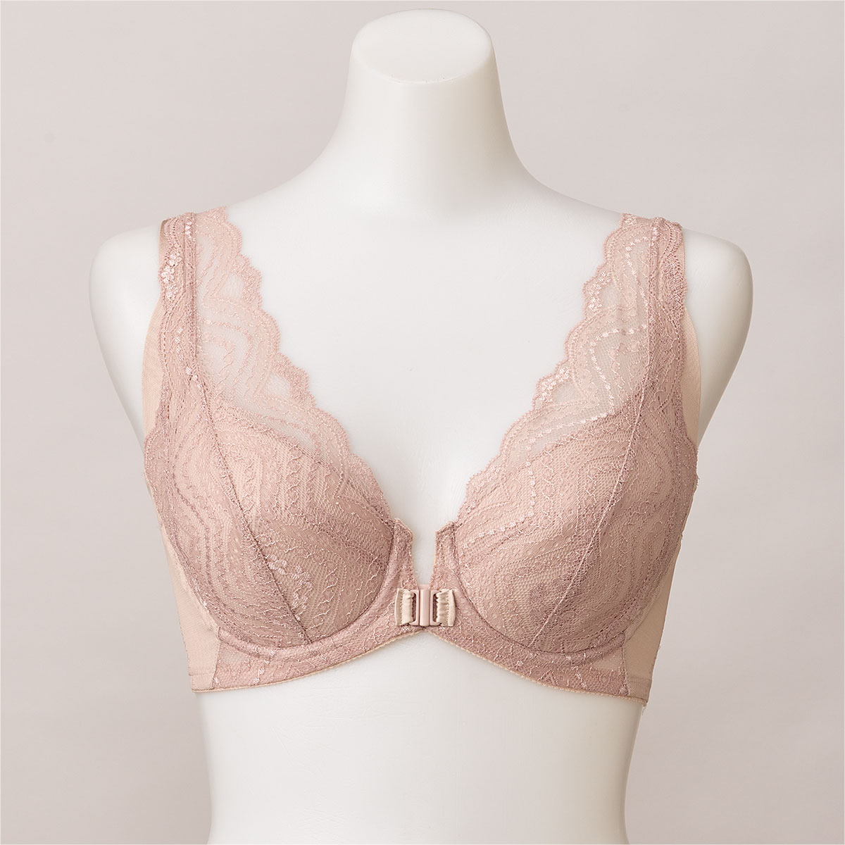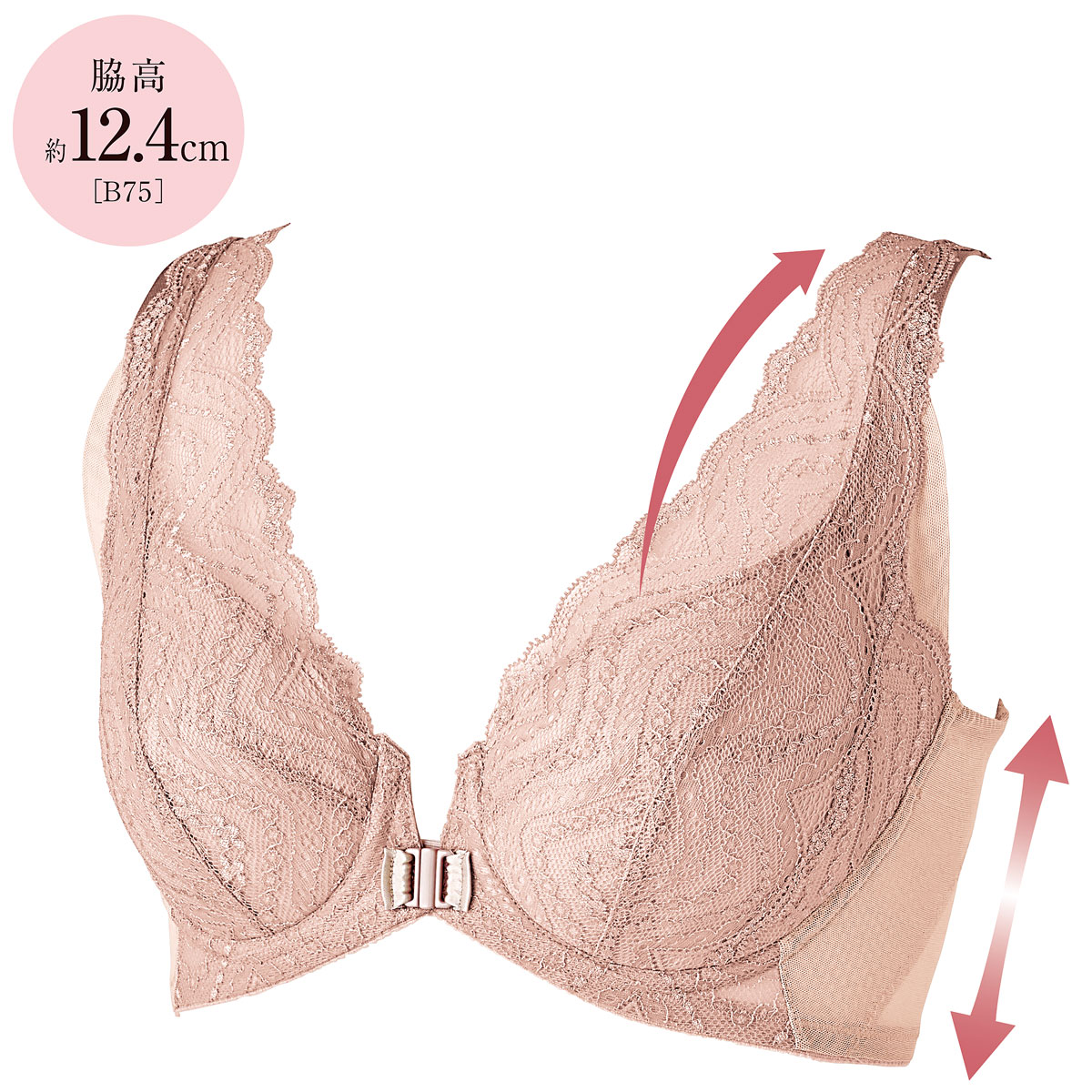 カップ脇のぷよぷよはみ肉をすっきり!脇肉を逃さない脇高設計で、カップ脇の折り返しパネルがお肉のはみ出しを防ぎます。また、カップ横から伸びるストラップでバストを脇へ逃さず引き上げます。着脱が簡単なフロントホックは、外付け&クッション付きで痛くなりにくい仕様に。背中は後ろホックなしでくい込みにくいから、後ろ姿もすっきりきれい。すっぽり安定感のあるフルカップタイプ。レースをあしらった上品フェミニンなデザインです。