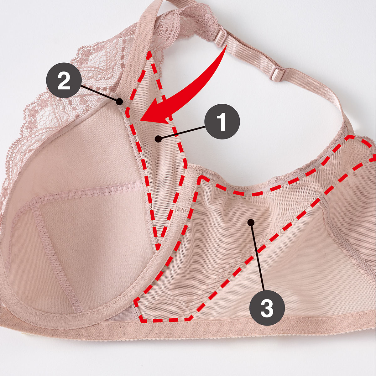 (1)サイドの折り返しパネルで脇肉をカップにおさめてバストのはみ出しを防ぐ。(2)カップ横から伸びるストラップでバストを脇へ逃さず引き上げ。(3)ぽっこりお肉が気になる部分はパワーネット2重ですっきり。