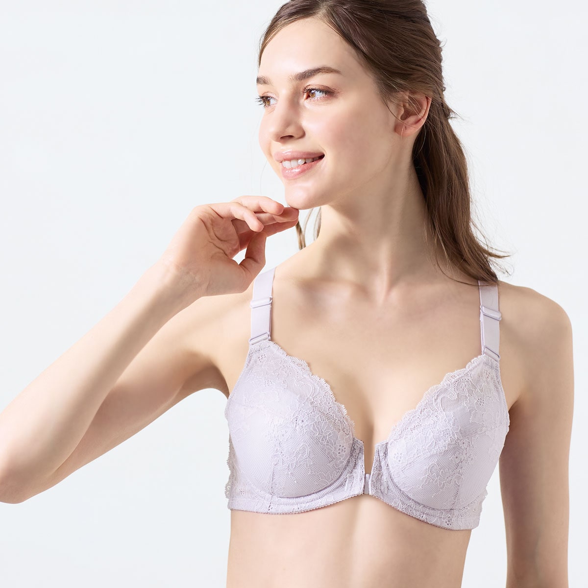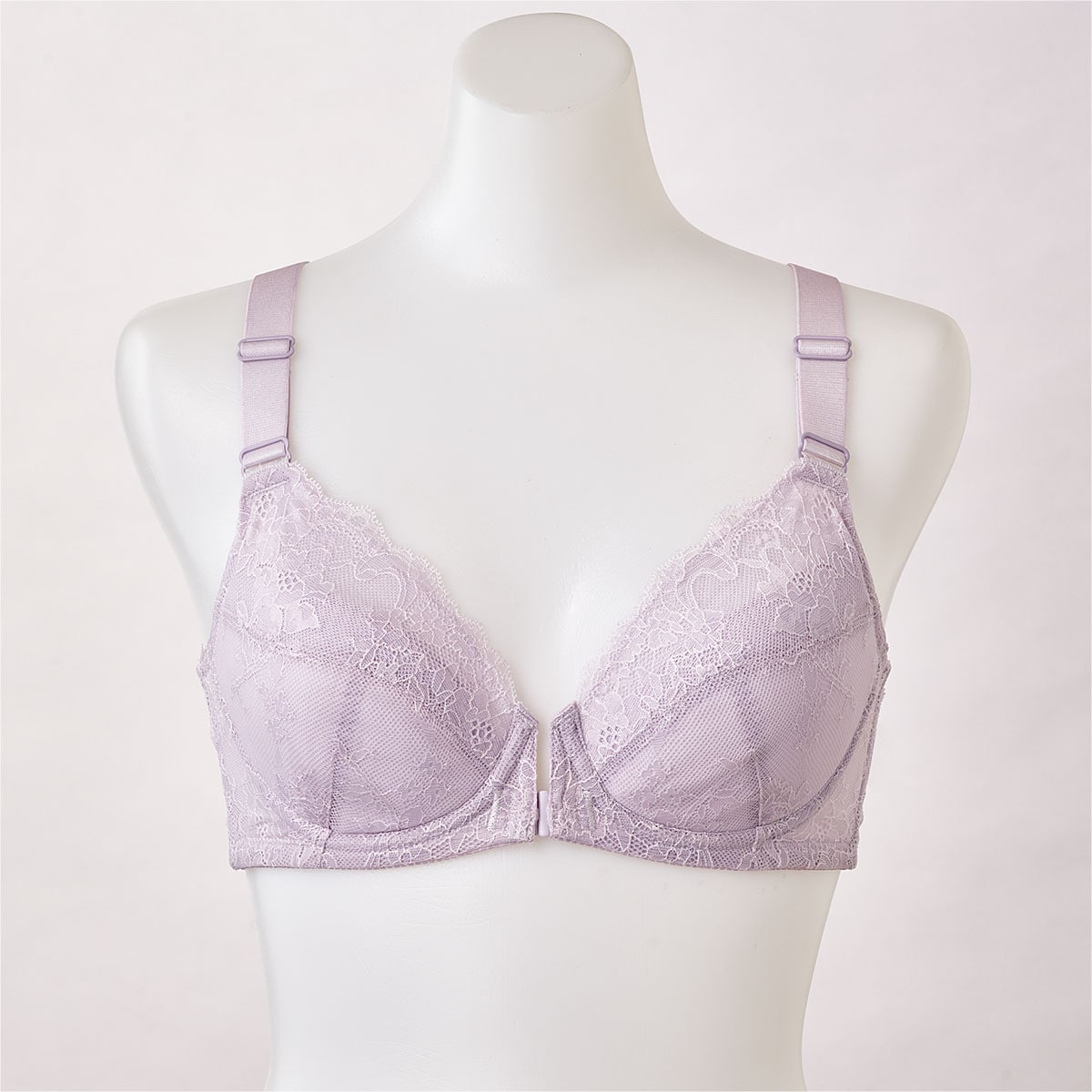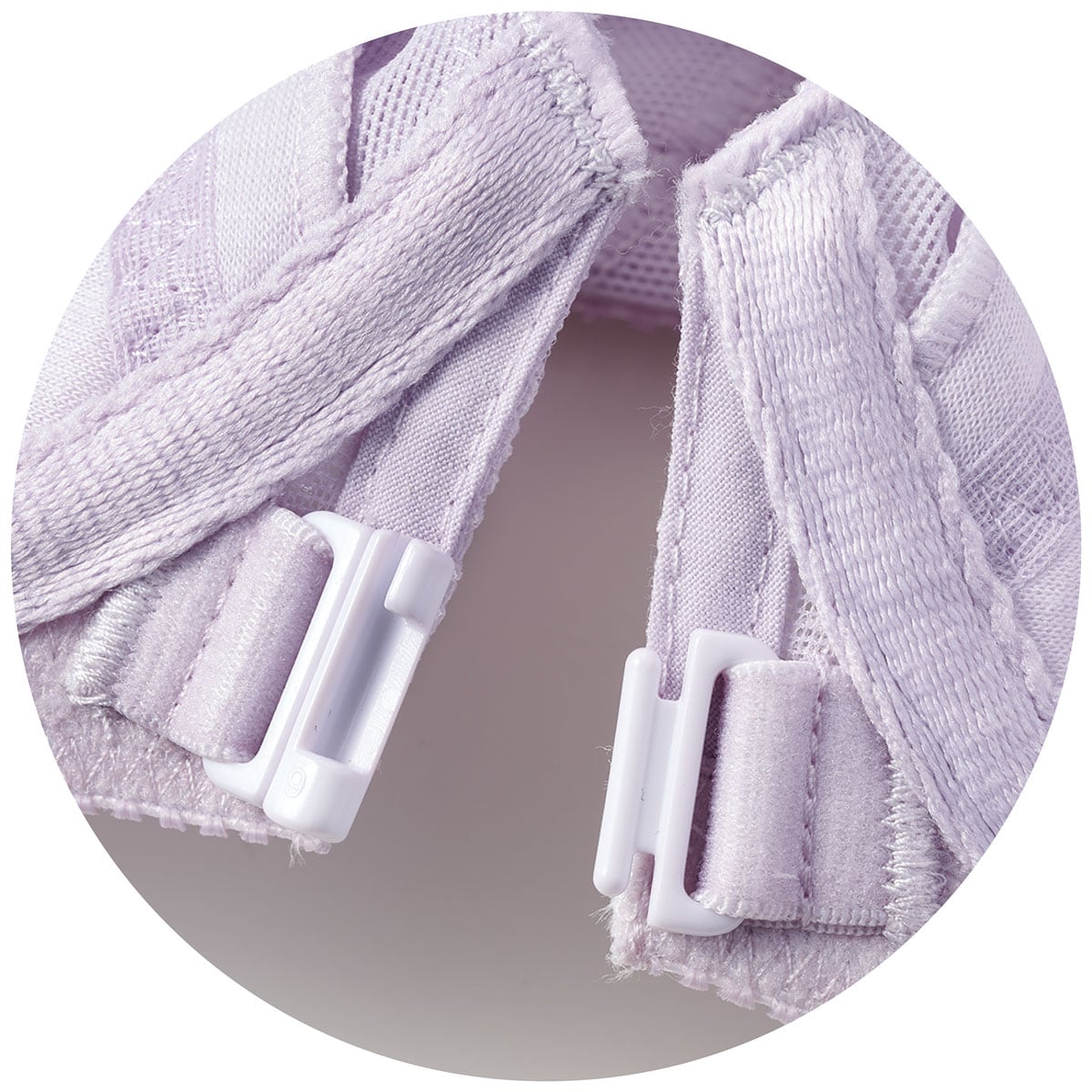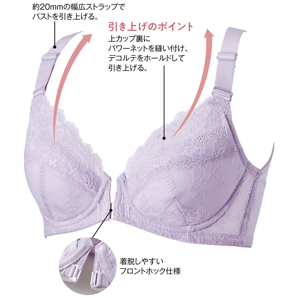 ペールライラック (1)約20mmの幅広ストラップでバストを引き上げる。(2)引き上げのポイント 上カップ裏にパワーネットを縫い付け、デコルテをホールドして引き上げる。(3)着脱しやすいフロントホック仕様
